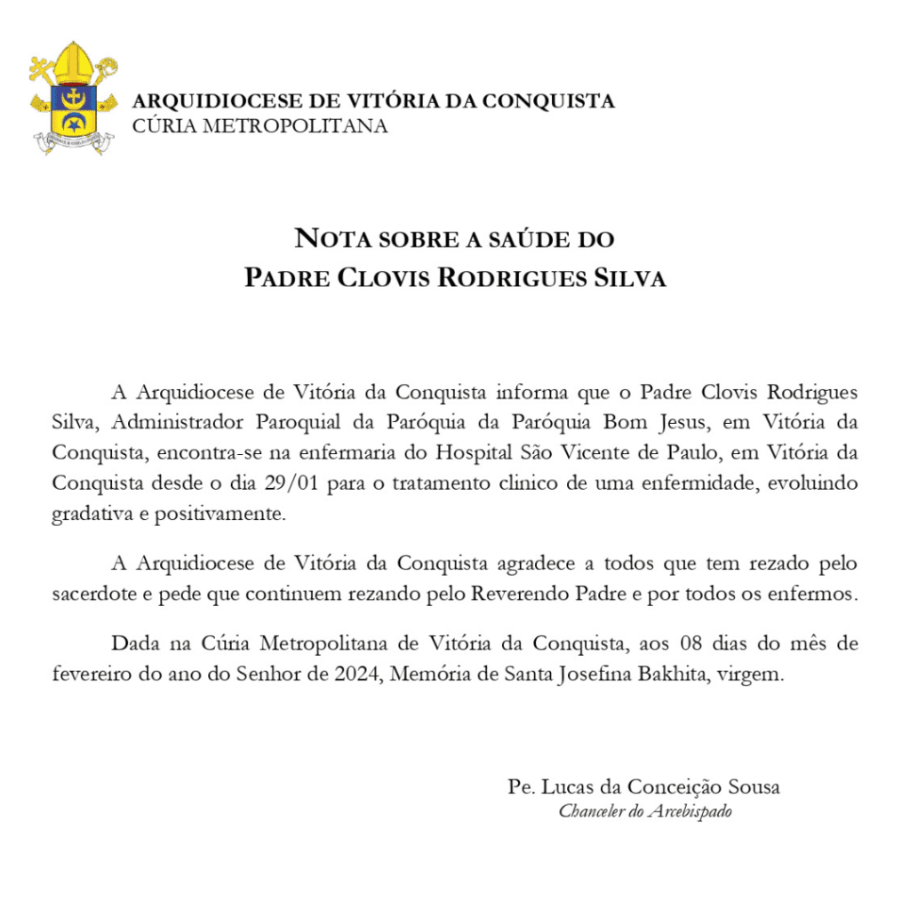 A Arquidiocese de Vitória da Conquista informa que o Padre Clovis Rodrigues Silva, Administrador Paroquial da Paróquia da Paróquia Bom Jesus, em Vitória da Conquista, encontra-se na enfermaria do Hospital São Vicente de Paulo, em Vitória da Conquista desde o dia 29/01 para o tratamento clinico de uma enfermidade, evoluindo gradativa e positivamente.
