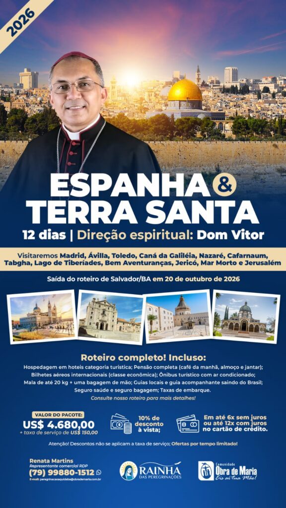 A Arquidiocese divulga a peregrinação à Espanha e à Terra Santa, promovida pela Comunidade Obra de Maria, em parceria com a agência Rainha das Peregrinações.