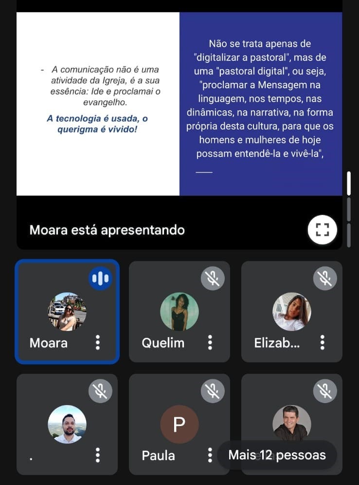“Pastoral de Comunicação em uma mudança de época: desafios e perspectivas”. Este foi o tema da formação online promovida pela Coordenação Arquidiocesana da Pastoral da Comunicação, ocorrida na última terça-feira, dia 17 de setembro. O Encontro realizado pelo aplicativo Google Meet iniciou-se às 20h30 com a oração feita pelo Pe. Lucas Conceição, Assessor Eclesiástico da PASCOM e encerrou-se às 22h00. O casal pasconeiro, Breno Lessa e Moara Brito, Coordenadores da PASCOM na Paróquia Rainha da Paz e São Vicente de Paulo, assessoraram a formação. Ambos estiveram presentes no 8° Encontro Nacional da PASCOM em julho de 2024, na cidade de Aparecida. Em sua exposição, eles partilharam sobre os momentos importantes desse encontro que reuniu mais de 900 pessoas de todo o país.