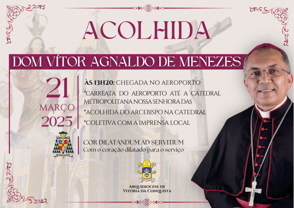 A Arquidiocese de Vitória da Conquista se prepara, com muita alegria e expectativa, para a posse canônica do seu Quarto Arcebispo Metropolitano, Dom Vítor Agnaldo de Menezes. A chegada do Arcebispo a Vitória da Conquista está prevista para 13h20 do dia 21, sexta-feira, e de lá sairá uma carreata que adentrará a cidade até chegar à Catedral Metropolitana Nossa Senhora das Vitórias, onde ele será acolhido com grande entusiasmo pelo povo de Deus.