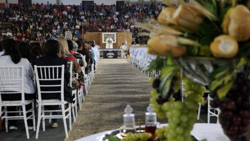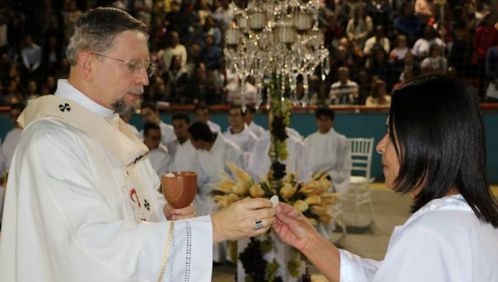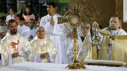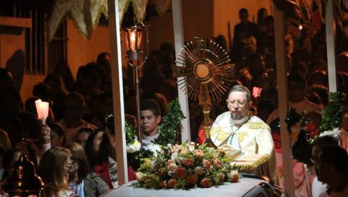 Durante toda a manhã desta quinta-feira de Corpus Christi, as paróquias da cidade de Vitória da Conquista, que formam o Vicariato São Lucas, estiveram em adoração ao Santíssimo Sacramento. Em algumas houve a Celebração da Santa Missa, especialmente para os idosos e Primeira Comunhão de crianças. À tarde, os fiéis se dirigiram ao Ginásio de Esportes Raul Ferraz, onde foi celebrada a Solene Eucaristia, presidida pelo Arcebispo Metropolitano, Dom Luís Pepeu. A Santa Missa foi concelebrada pelos Padres do Vicariato. A celebração contou com a presença dos Diáconos permanentes, religiosos e religiosas, seminaristas, vocacionados e uma multidão de fiéis que superlotaram o Ginásio. O Metropolita acolheu a todos, recordando que “a celebração da Solenidade de Corpus Christi, fonte de unidade e de paz, é uma boa oportunidade para rezarmos por nos país. Quem participa da Eucaristia não pode deixar de ser artífice da unidade e da paz”. Na homilia, Dom Luís exortou aos presentes: “Jesus Cristo é o centro da comunidade eclesial, por isso a Eucaristia é o centro de nossa comunidade cristã. Celebrando hoje Corpus Christi, queremos renovar o nosso compromisso com Jesus Cristo na comunidade, que é sua Igreja”. Por fim, o Arcebispo recordou: “a Celebração Eucarística é muito mais do que um simples banquete: é precisamente o memorial da Páscoa de Jesus. Nunca compreenderemos todo o seu valor e toda a sua riqueza”. Logo após a Celebração, prosseguiu-se com uma linda e emocionante Procissão com Jesus Eucarístico, seguido pela multidão de fiéis que, entre orações, cantos e hinos eucarísticos louvavam a Deus pelo grande dom de sua presença no Santíssimo Sacramento. Em frente à igreja Catedral, foi preparado um altar para os Ritos Finais deste dia de piedade eucarística, encerrando Solenemente com a Bênção do Santíssimo Sacramento. Após a Bênção, Dom Luís Pepeu leu a nota oficial da CNBB sobre o atual momento do Brasil.