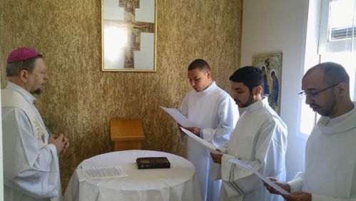 Conforme determina a disciplina da Igreja, aquele que é chamado a receber um ministério na Igreja deve emitir a Profissão de Fé e o Juramento de Fidelidade, segundo as fórmulas aprovadas pela Sé Apostólica. Por isso, na manhã deste sábado (5), na Capela da Residência Episcopal, Dom Luís Pepeu, Arcebispo Metropolitano, recebeu a Profissão de Fé e Juramento de Fidelidade dos candidatos às ordens sacras, Adson Coelho, Edvaldo Fillipe e Eugênio Gonçalves, que receberão a Ordem do Diaconato. Na oportunidade também foram abençoadas as vestes dos futuros diáconos. Estiveram presentes os Párocos das Comunidades onde eles realizam o Estágio Pastoral: Pe. Zenilton, Pe. Ariosvaldo e Pe. Gerson. Também o Pe. Leandro Oliveira, da Diocese de Barreiras e o Candidato ao Diaconato da Diocese de Livramento de Nossa Senhora, Adriano Bonfim, participaram do Rito.