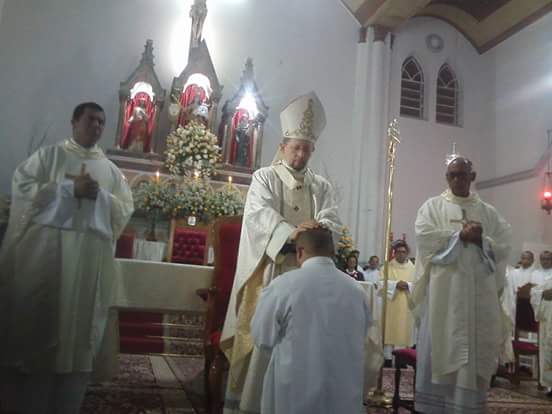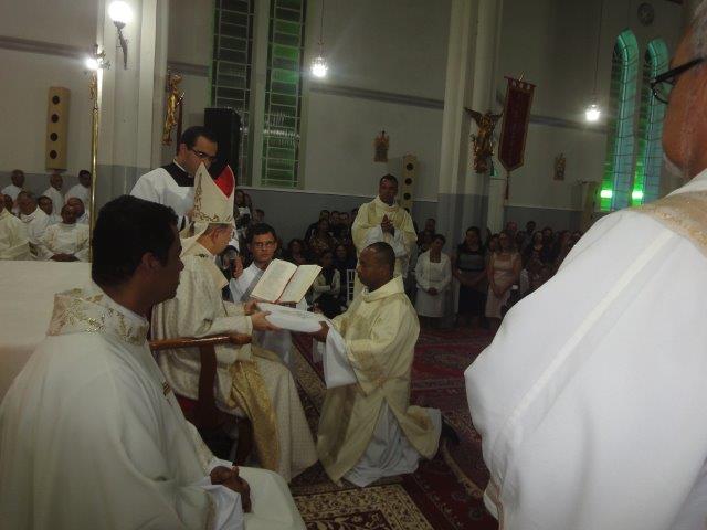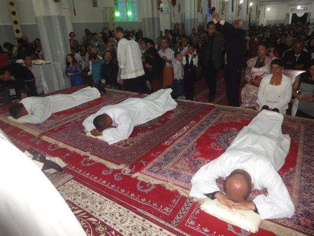 Ao entardecer deste sábado, 27 de agosto, a Igreja Arquidiocesana de Conquista ganhou mais três diáconos, um transitório e dois permanentes. Pela imposição das mãos de Dom Luís, em solene celebração eucarística na Igreja Catedral, o seminarista Antônio, filho da comunidade paroquial de Nossa Senhora das Graças em Cândido Sales, Genildo, membro da comunidade paroquial Nossa Senhora Rainha da Paz, e Ivanderlei, membro da Comunidade paroquial Nossa Senhora de Fátima, foram ordenados para o primeiro grau do sacramento da Ordem. A celebração eucarística teve a participação de quase todos os padres e dos diáconos permanentes da Arquidiocese, além de sacerdotes e diáconos vindos de outras dioceses. Estavam presentes também os religiosos e religiosas e os seminaristas da Arquidiocese e de outras localidades. Com a Igreja Catedral repleta de fieis vindos das diversas comunidades, além dos familiares e amigos dos ordenandos, às 5 horas, já nos primeiros instantes do crepúsculo vespertino, após a motivação inicial que introduziu os participantes a esta festa de ordenação para o ministério do Serviço, começou a solene procissão de entrada, formada pelo Arcebispo, Concelebrantes e Diáconos, Ministros, Seminaristas, Acólitos e Coroinhas e os Candidatos ao Diaconato. Após a liturgia da Palavra, deu-se início ao rito de ordenação diaconal com a chamada e apresentação dos candidatos. O Arcebispo Dom Luís iniciou a homilia com uma saudação a todos os presentes, especialmente aos familiares dos ordenandos. Expressou durante a homilia sua alegria e satisfação pela ordenação, acolhendo-os como esperança para a Igreja necessitada de operários. Lembrou que esta ordenação ocorre no contexto do “Ano da Misericórdia” e como coroamento do mês vocacional. Fundamentando-se nas leituras propostas para esta celebração, recordou que o diaconato ou a diaconia é serviço, amor, entrega, doação. Enfatizou que o diácono deve ser um servidor da Palavra, do altar e da caridade. Congratulou-se com os ordenandos pela coragem e entrega confiante em Deus na busca de servir, quando a tendência geral do mundo de hoje é servir-se, fazer-se servo quando o sonho comum é ser senhor e patrão. Por fim, invocou sobre os ordenandos a proteção constante de Nossa Senhora. Terminada as palavras de exortação, Dom Luís interrogou os eleitos sobre seus propósitos. Seguindo o rito, os eleitos prometem respeito e obediência aos sucessores dos apóstolos. Em seguida, os eleitos ao diaconato se prostraram no chão em sinal de total entrega a Deus. Toda a Igreja, então, em atitude de oração por estes irmãos, entoa o canto da Ladainha. Em seguida, estando os ordenandos de joelho, Dom Luís impõe as mãos sobre a cabeça dos eleitos e, após um momento de silêncio, de mãos estendidas, faz a prece de ordenação. Os ordenados foram revestidos com a estola e dalmática e, de joelhos, recebem das mãos de Dom Luís o Evangelho de Cristo. Por fim, Dom Luís, através de um caloroso abraço, acolhe os neodiáconos e deseja-lhes a paz. Em seguida, eles foram acolhidos e saudados pelos outros diáconos. A liturgia foi muito bem preparada. O clima reinante de um profundo silêncio orante na Igreja foi surpreendente e conferiu uma beleza ímpar à celebração.