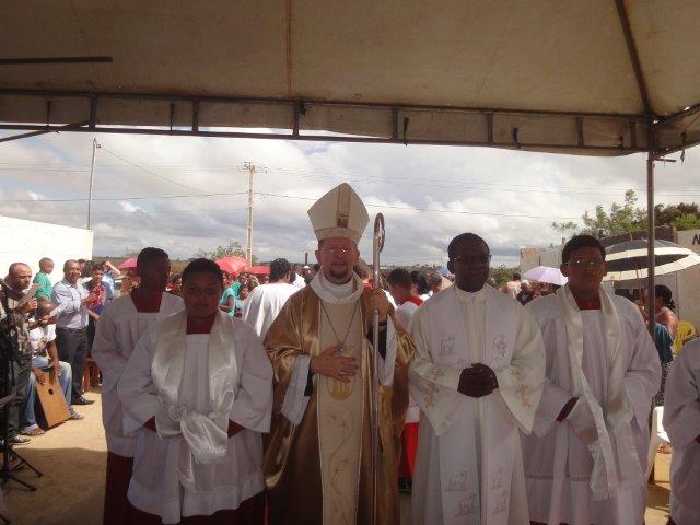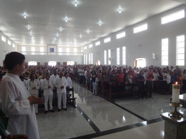 Dom Luís, nesta quinta-feira, (23), véspera de São João, esteve na Paróquia de São Pedro, em Macarani, para celebrar a Santa Missa dentro do Novenário em preparação à festa do excelso Padroeiro de Macarani, São Pedro. Nesta celebração eucarística, Dom Luís também crismou um grupo de 56 pessoas entre jovens e adultos, membros da Comunidade paroquial. O Novenário da Festa de São Pedro, constituindo um marco na celebração do Ano Santo da Misericórdia, teve como tema: “Igreja, Casa da Misericórdia” e como lema: “Com São Pedro, seremos bem-aventurados se praticarmos a misericórdia uns com os outros” (cf. Mt 5,7). Já o tema que norteou esta 4ª. noite do Novenário foi: “Vestir os despidos e advertir os pecadores” (Mt 25, 32-36). Iluminado por este tema, Dom Luís, em sua homilia, ao falar da Misericórdia, destacou as obras de misericórdia como sinais concretos e expressão da própria misericórdia. Do mesmo modo que Jesus é misericordioso, assim também deve ser cada um em relação ao outro. O agir de Jesus foi sempre pautado por seu amor misericordioso: acolhendo, perdoando, amando sem limites, curando, salvando, libertando, resgatando do pecado e da morte, devolvendo a vida e a dignidade humana. Assim também deve ser o agir do cristão: realizar as obras de misericórdia, reconhecendo a presença de Jesus nas pessoas que foram destituídas da própria dignidade. Vestir os despidos, esta constitui uma expressão fundamental da acolhida dos valores do Reino dos Céus indicados por Jesus mediante sua ação evangelizadora e libertadora. Dom Luís exortou toda a Comunidade cristã de Macarani a deixar-se ser tocada interiormente pela mensagem do Novenário e da Festa de São Pedro através da conversão do coração em vista de uma vida nova assumida pela prática da Palavra de Deus, a exemplo do próprio padroeiro e da Virgem Maria. Por fim, Dom Luís dirigiu uma palavra de exortação aos mais de cinquenta crismandos, levando-os a refletir e a meditar sobre o verdadeiro significado do sacramento da Crisma que, dentro de poucos instantes, iriam receber. Reportou-se, especialmente, ao compromisso do crismado como Igreja Vida, participante, cristão comprometido e engajado com a Comunidade local e com toda a Igreja, comprometendo-se ativamente com a ação pastoral e evangelizadora. Além da presença do pároco Pe. José Carlos, que concelebroou com o Arcebispo, uma grande multidão de fiéis se encontrava na Igreja, deixando-a totalmente lotada. No final da celebração, houve uma efusão de alegria na assembleia e muitos também quiseram saudar o Bispo, sempre demonstrando um gesto de carinho e de afeto.