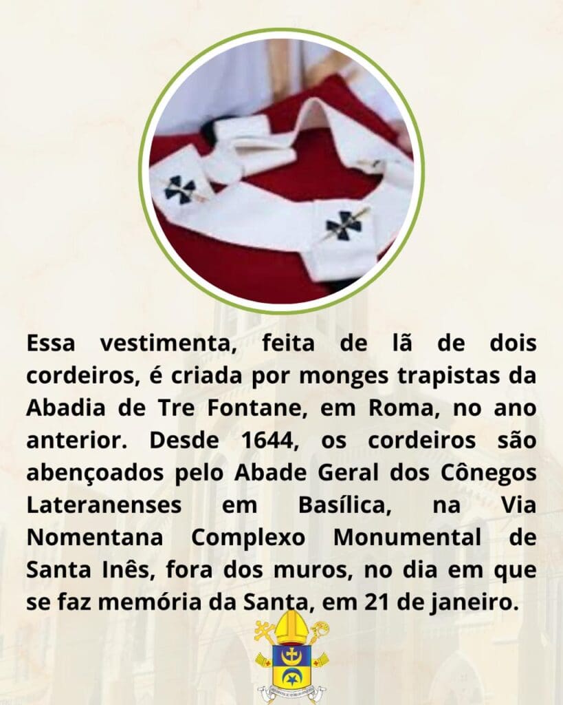 Dois cordeiros, criados pelos monges trapistas da Abadia de Tre Fontane, fornecem a lã. Eles são abençoados em 21 de janeiro, festa de Santa Inês, e levados ao Papa. As freiras do convento de Santa Cecília, em Trastevere, tecem e costuram os pálios, que ficam guardados na Basílica de São Pedro, junto ao túmulo do apóstolo.