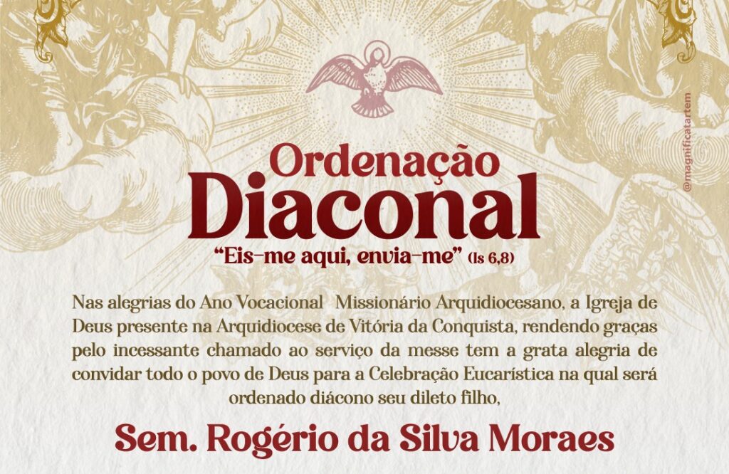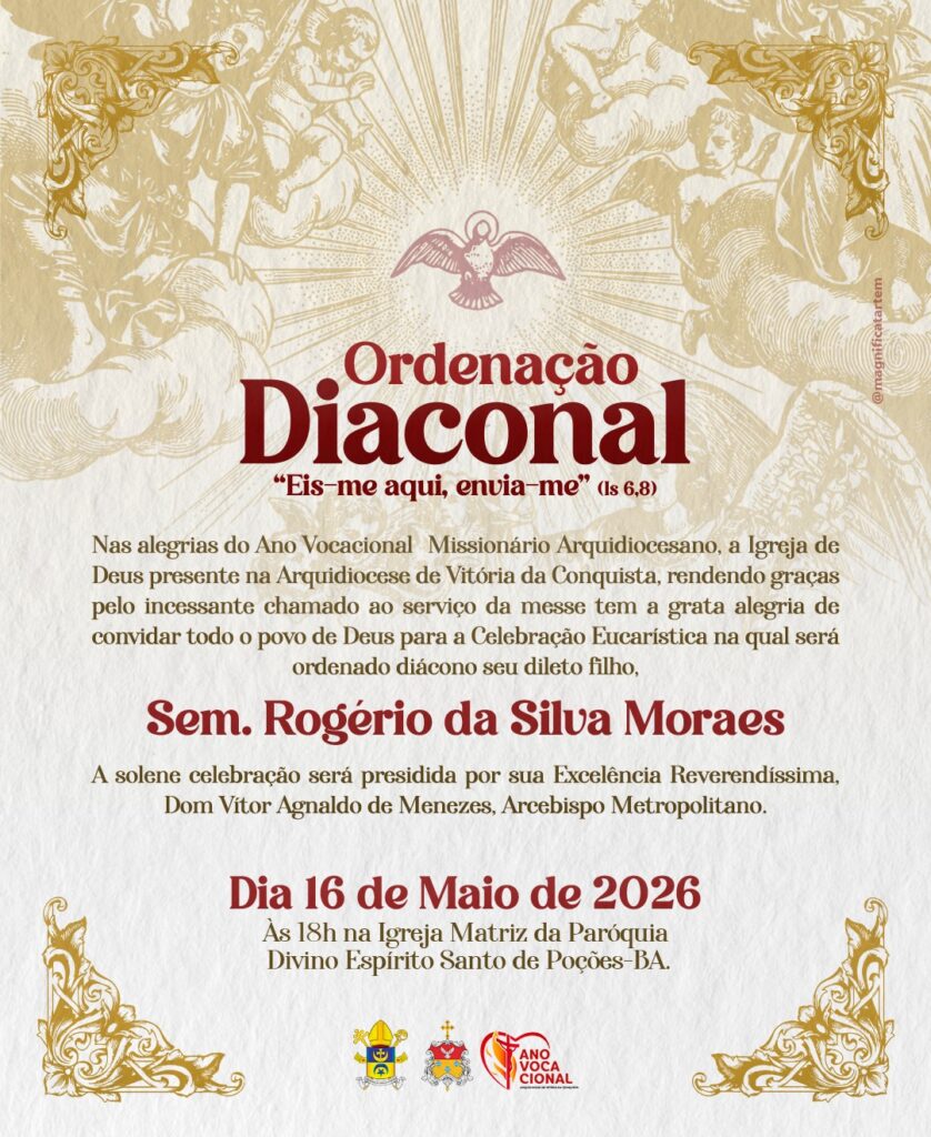 Com imensa alegria a Arquidiocese de Vitória da Conquista anuncia a Ordenação Diaconal do Sem. Rogério da Silva Moraes, que será realizada no dia 16 de maio, às 18h, na Paróquia Divino Espírito Santo, em Poções.