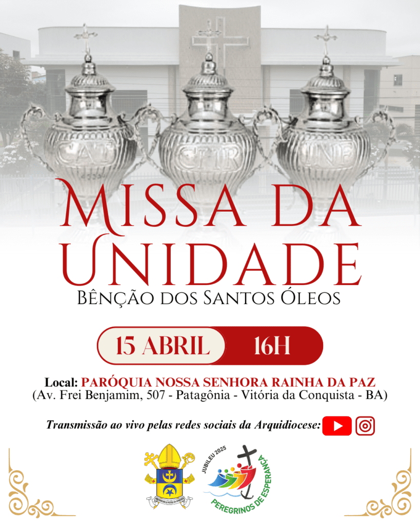 A Arquidiocese de Vitória da Conquista convida todos os fiéis para a Missa da Unidade, também conhecida como Missa dos Santos Óleos. A celebração acontecerá no dia 15 de abril, às 16h, na Paróquia Nossa Senhora Rainha da Paz, localizada na Av. Frei Benjamim, 507, no bairro Patagônia, em Vitória da Conquista.