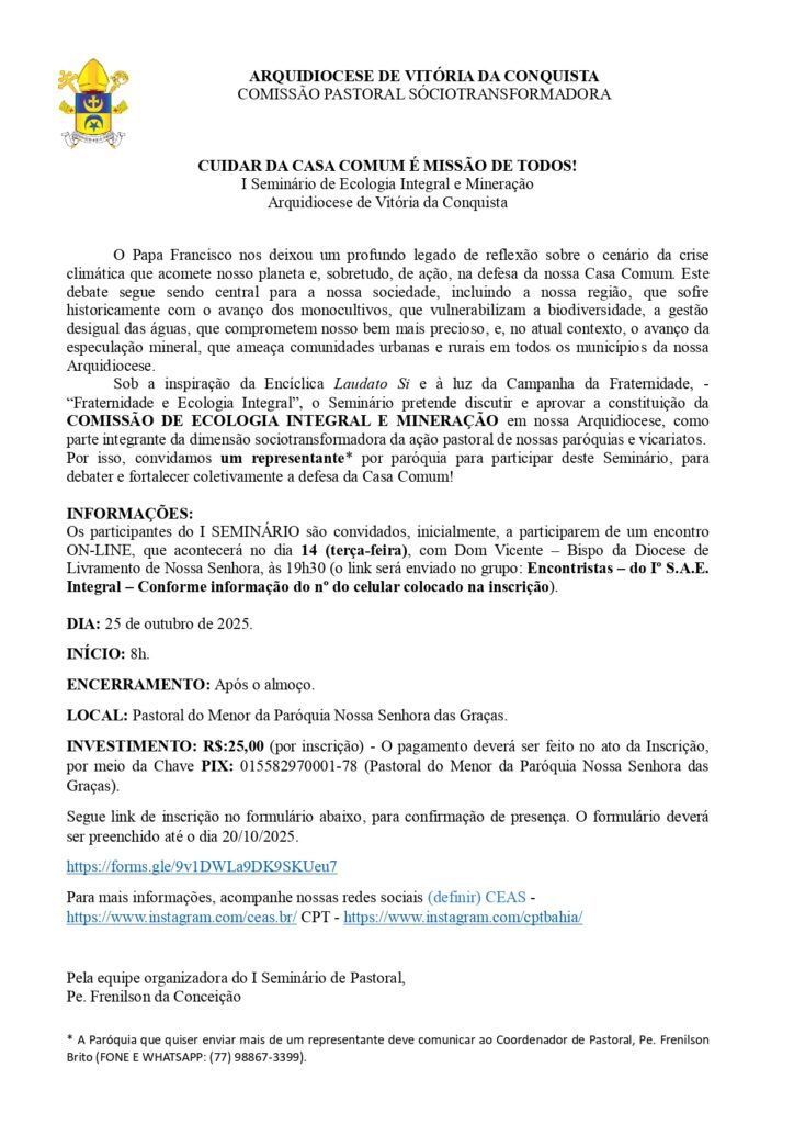 A Arquidiocese realizará o I Seminário de Ecologia Integral e Mineração, que será realizado no dia 25 de outubro às 08hs na Pastoral do Menor, em Vitória da Conquista. É importante que tenha um representante de cada Paróquia para participar deste Seminário, para debater e fortalecer coletivamente a defesa da Casa Comum.