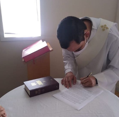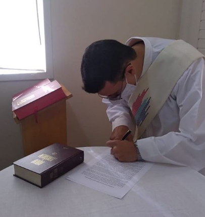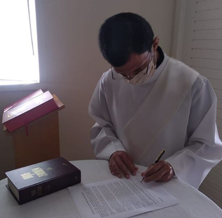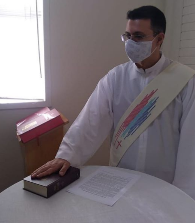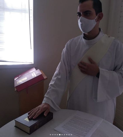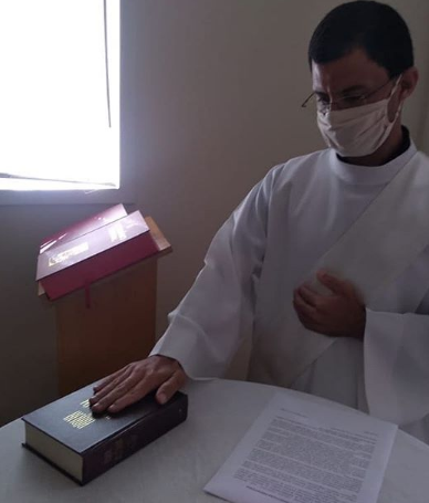 Na manhã desta quinta-feira, 30/07, os Diáconos, Uatos, Wagner e Wanderson, que serão ordenados Presbíteros no dia 1º de agosto, tiveram abençoados os paramentos que receberão no dia da Ordenação, bem como o cálice e a paterna, isto para significar que se destinam unicamente ao Culto Divino. Ao término, professaram o Juramento de Fidelidade. Esse ato faz parte da preparação imediata para a Ordenação.