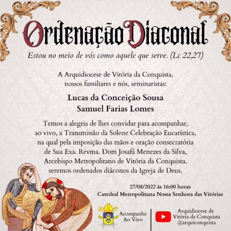 Convite para Ordenação Diaconal dos Seminaristas, Lucas e Samuel “Estou no meio de vós como aquele que serve.” (Lc 22,27) É com imensa alegria que a Arquidiocese de 1 de agosto de 2022