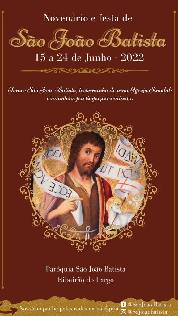 Programação da Festa de São João Batista, Ribeirão do Largo No próximo dia 15 de junho, a Paróquia São João Batista de Ribeirão do Largo, iniciará o novenário em 13 de junho de 2022