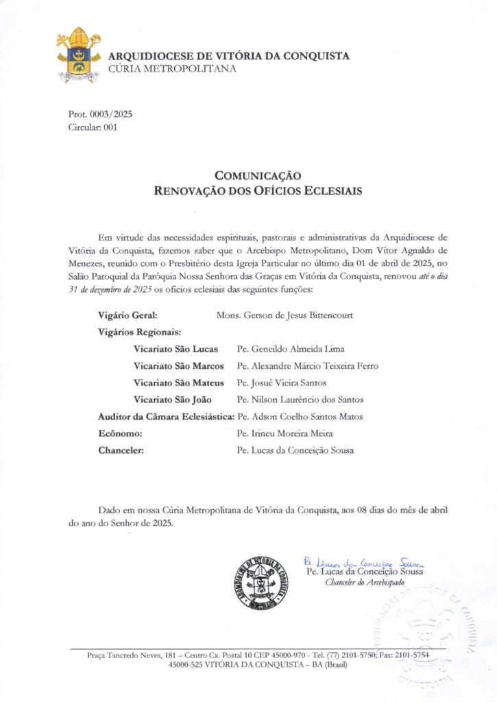 Em virtude das necessidades espirituais, pastorais e administrativas da Arquidiocese de Vitória da Conquista, fazemos saber que o Arcebispo Metropolitano, Dom Vítor Agnaldo de Menezes, reunido com o Presbitério desta Igreja Particular no último dia 01 de abril de 2025, no Salão Paroquial da Paróquia Nossa Senhora das Graças em Vitória da Conquista, renovou até o dia 31 de dezembro de 2025 os ofícios eclesiais das seguintes funções: