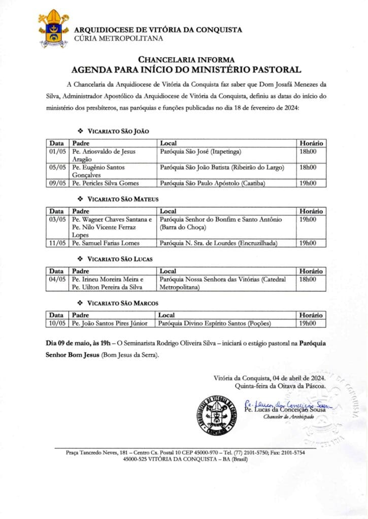 A Chancelaria da Arquidiocese de Vitória da Conquista faz saber que Dom Josafá Menezes da Silva, Administrador Apostólico da Arquidiocese de Vitória da Conquista, definiu as datas do início do ministério dos presbíteros, nas paróquias e funções publicadas no dia 18 de fevereiro de 2024:
