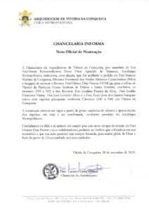 A Chancelaria da Arquidiocese de Vitória da Conquista, por mandato de Sua Excelência Reverendíssima Dom Vítor Agnaldo de Menezes, Arcebispo Metropolitano, comunica, com alegria, que foi acolhido o pedido do Frei Marcos Martins de Cerqueira, Ministro Provincial dos Frades Menores Capuchinhos (Bahia e Sergipe) de nomear o Revmo. Frei Gleizer Dias Passos, OFMCap, para o ofício de Pároco da Paróquia Nossa Senhora de Fátima e Santo Antônio, conforme os cânones: (519 a 532) e dos Revmos. Frei Jesulino Pereira da Silva, Frei Aroldo Francisco Vieira; Frei José Geraldo Alves e o Frei Paulo José dos Santos Sampaio como seus vigários paroquiais conforme Cânones: (545 a 548) em Vitória da Conquista.