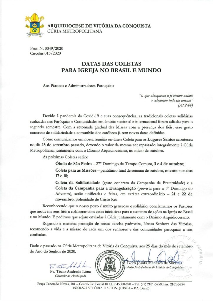 Segue abaixo a Circular 013/2020, orientando aos Párocos e Administradores Paroquiais a respeito das Coletas para a Igreja no Brasil e no mundo, que por conta da pandemia foram adiadas para o segundo semestre desse ano.