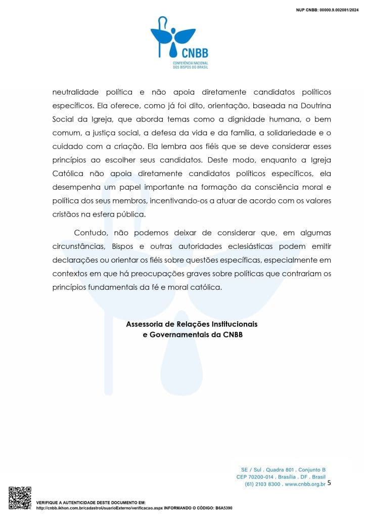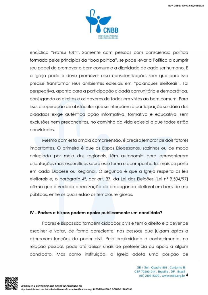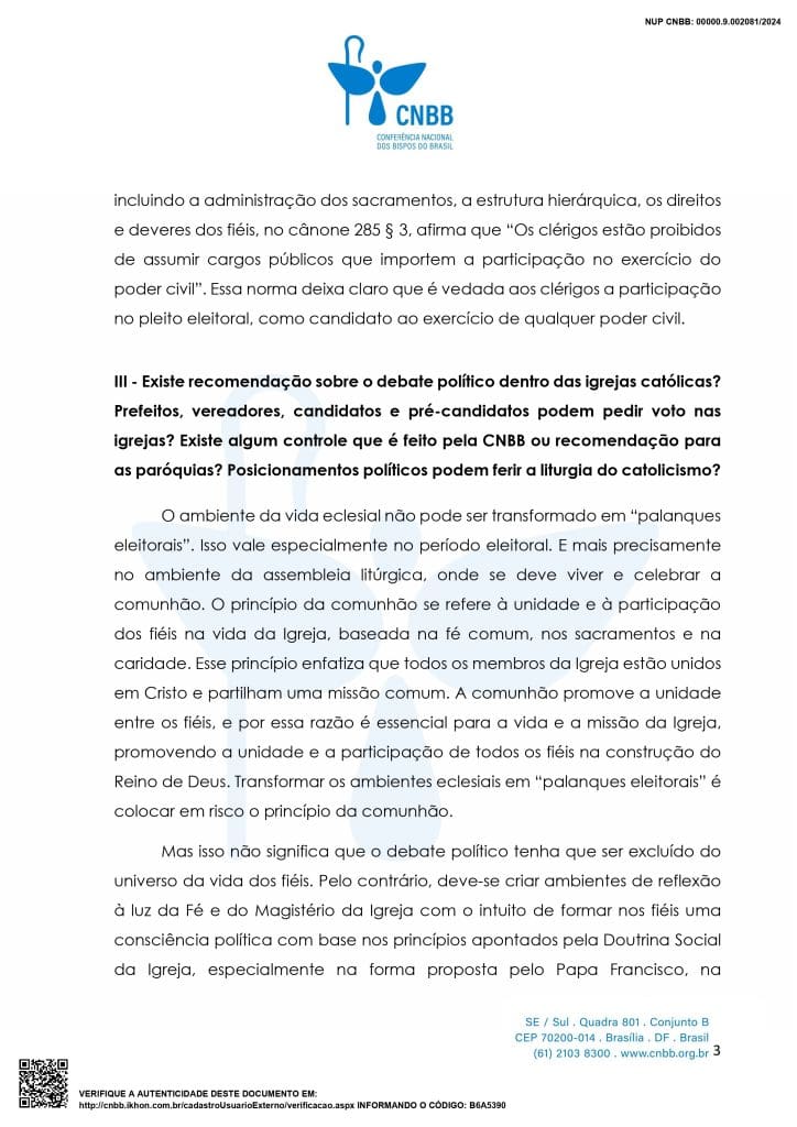Os outros pontos abordam a candidatura de padres e bispos, o debate político dentro das Igrejas Católicas e o pedido de votos nas celebrações e sobre o apoio de padres e bispos a candidatos.