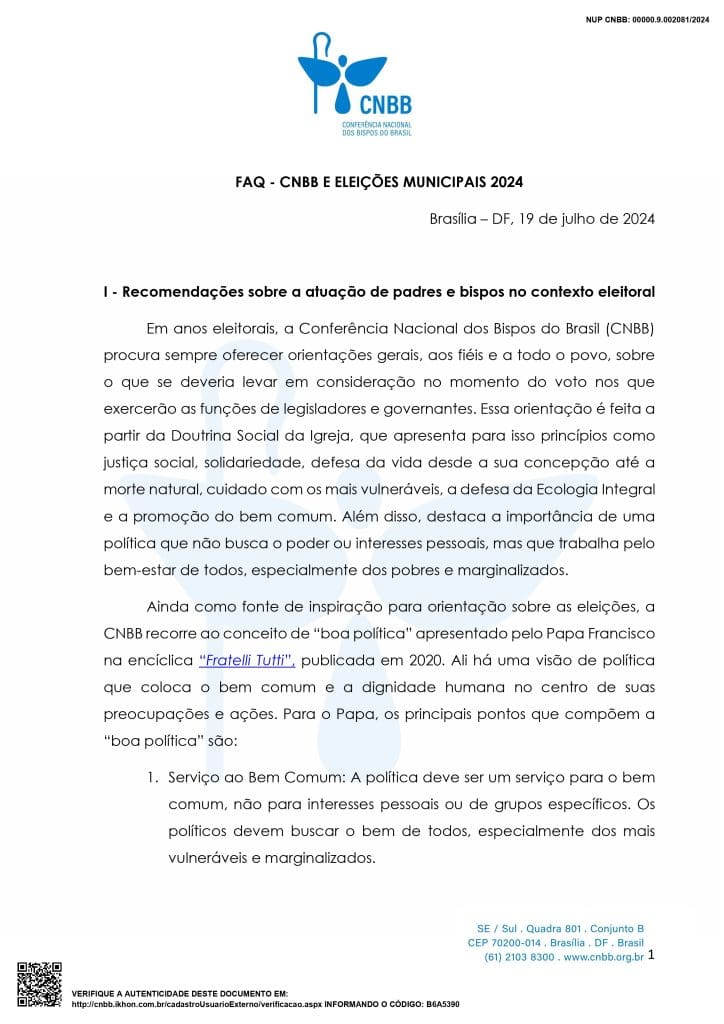 Os outros pontos abordam a candidatura de padres e bispos, o debate político dentro das Igrejas Católicas e o pedido de votos nas celebrações e sobre o apoio de padres e bispos a candidatos.