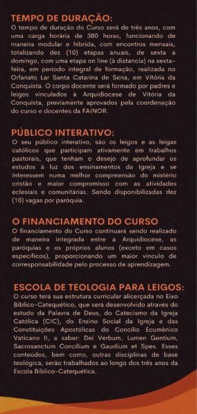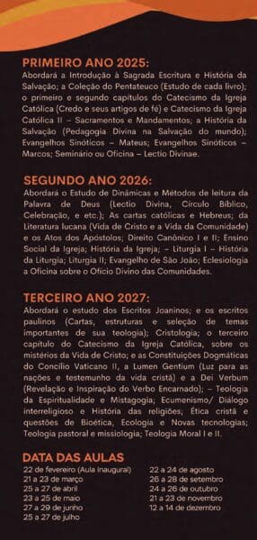 A busca pelo aprofundamento teológico e pastoral, expressa o interesse e compromisso dos leigos e leigas, agentes de pastorais, pelo desenvolvimento de um serviço transformador nas comunidades eclesiais e sociais. “Livros Proféticos e Profecia” foi uma disciplina lecionada aos alunos do primeiro ano, ministrada pelo Ms. Daniel Picolli. Para os alunos do segundo ano foi ofertada conforme a ementa do Curso a disciplina Doutrina Social da Igreja, ministrada pelo Pe. Wanderson Aminadab, Administrador Paroquial da Paróquia Sagrado Coração de Jesus (Vitória da Conquista).