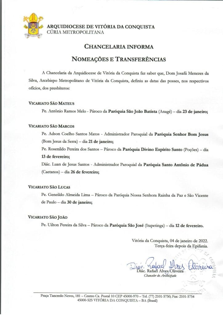 A Chancelaria da Arquidiocese de Vitória da Conquista faz saber que, Dom Josafá Menezes da Silva, Arcebispo Metropolitano de Vitória da Conquista, definiu as datas das posses, nos respectivos ofícios, dos presbíteros: