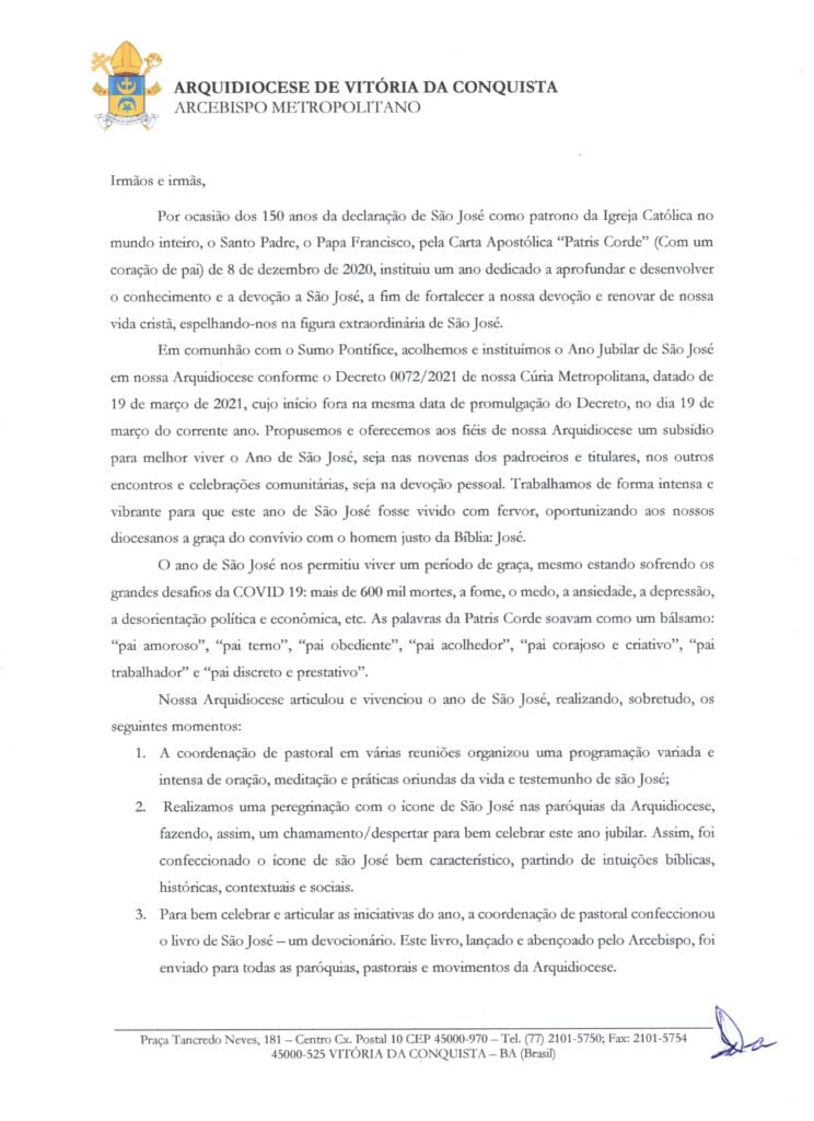 Por ocasião dos 150 anos da declaração de São José como patrono da Igreja Católica no mundo inteiro, o Santo Padre, o Papa Francisco, pela Carta Apostólica “Patris Corde” (Com um coração de pai) de 8 de dezembro de 2020, instituiu um ano dedicado a aprofundar e desenvolver o conhecimento e a devoção a São José, a fim de fortalecer a nossa devoção e renovar de nossa vida cristã, espelhando-nos na figura extraordinária de São José. Em comunhão com o Sumo Pontífice, acolhemos e instituímos o Ano Jubilar de São José em nossa Arquidiocese conforme o Decreto 0072/2021 de nossa Cúria Metropolitana, datado de 19 de março de 2021, cujo início fora na mesma data de promulgação do Decreto, no dia 19 de março do corrente ano.