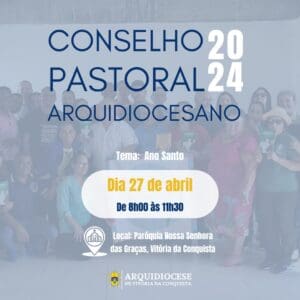Acontecerá no próximo sábado, dia 27 de abril de 2024, a primeira reunião do Conselho Pastoral Arquidiocesano deste ano. O encontro destinado aos coordenadores das Pastorais, grupos, movimentos, associações e apostolados leigos e padres assistentes eclesiásticos destes organismos pastorais. A condução dos trabalhos será feita pelo Coordenador de Pastoral, Padre Frenilson da Conceição Brito, e pelo Administrador Apostólico, Dom Josafá Menezes da Silva. O local será no salão da Paróquia Nossa Senhora das Graças, em Vitória da Conquista, de 8h00 às 11h30 da manhã.