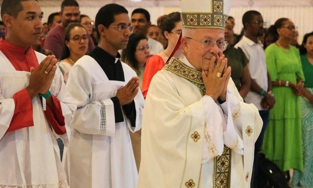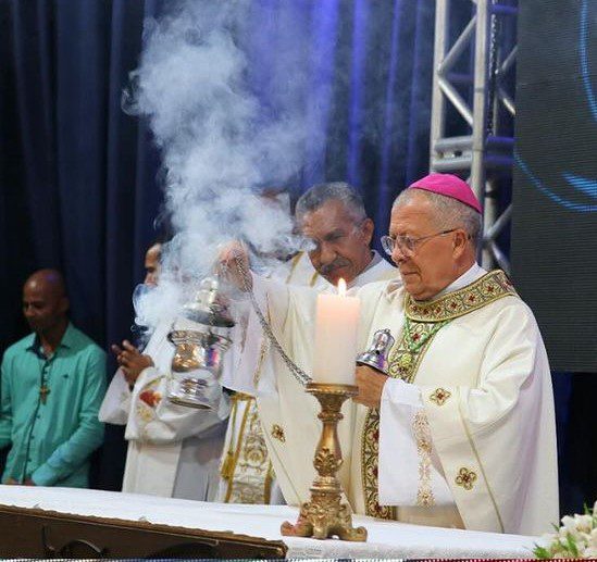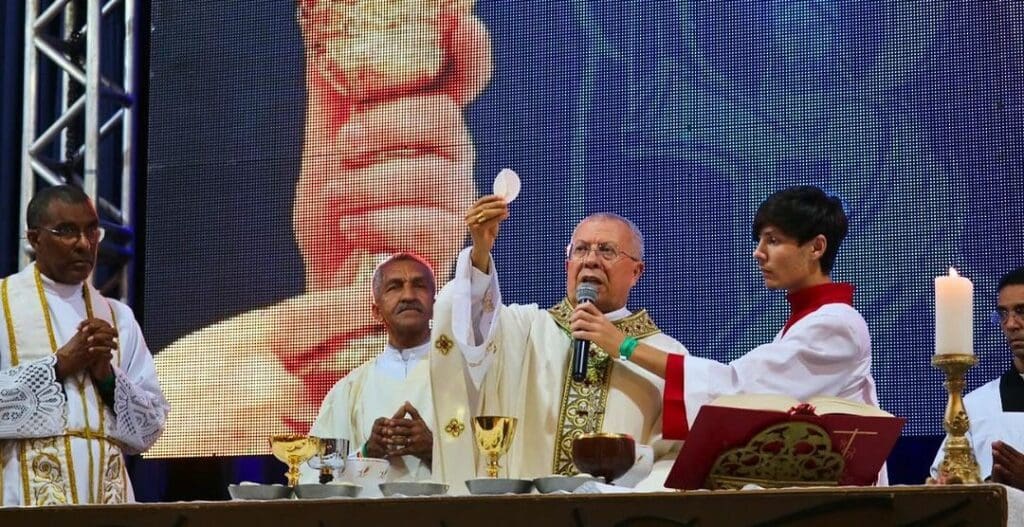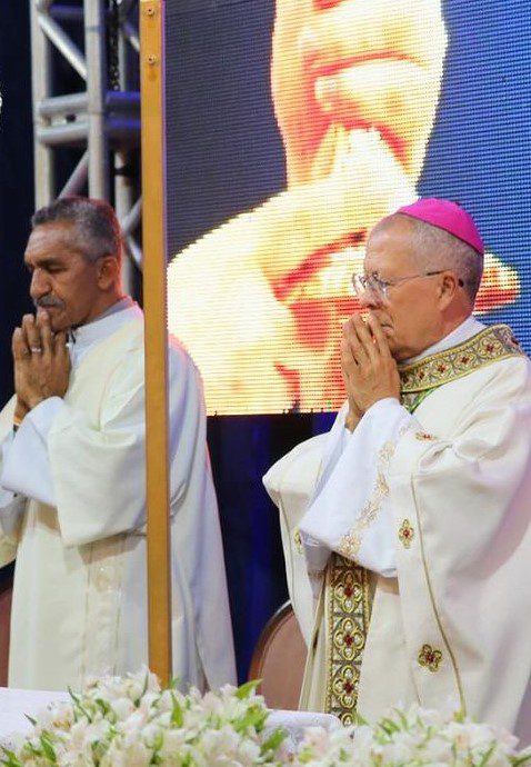 Na Santa Missa de encerramento do Encontro Estadual, o Administrador Apostólico da Arquidiocese de Vitória da Conquista, Dom Josafá, presidiu a celebração e estavam concelebrando o Pe. Nailson Gonçalves, Assessor Eclesiástico da RCC em nossa Arquidiocese, entre muitos outros Presbíteros que vieram das Dioceses vizinhas.