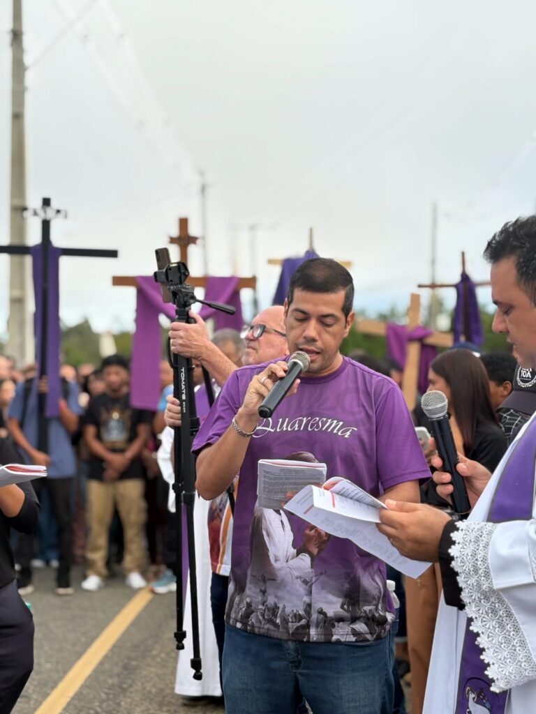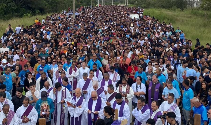 Na manhã desta sexta-feira, 03 de abril, uma multidão de fiéis se reuniu para a tradicional Via Sacra em direção ao Cristo Crucificado de Mário Cravo, marcando o segundo dia do Tríduo Pascal na cidade.