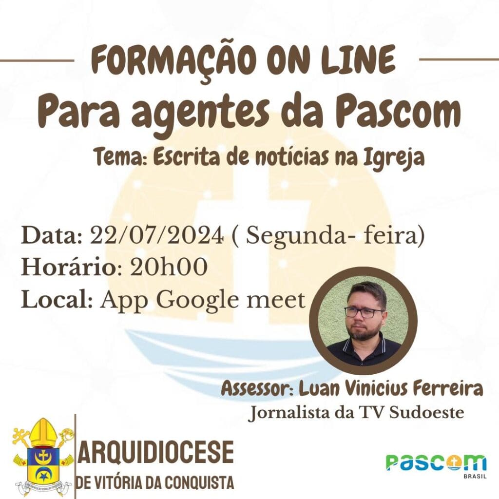 Haverá uma formação online para os leigos e leigas que atuam na Pastoral da Comunicação das Paróquias da Arquidiocese. Será no próximo dia 22/07, segunda-feira, às 20h00 pelo aplicativo Google Meet.