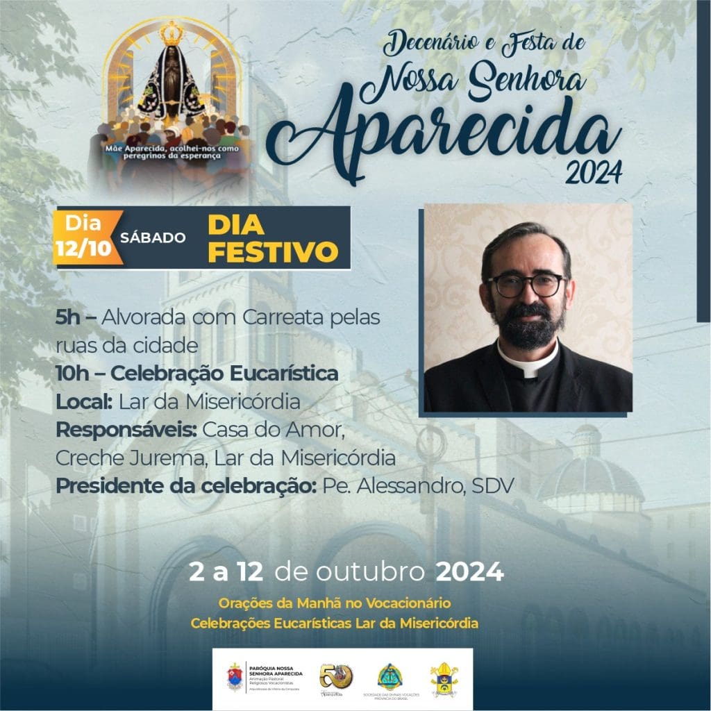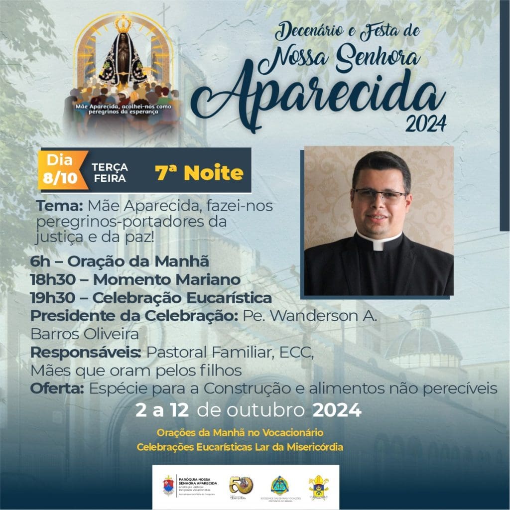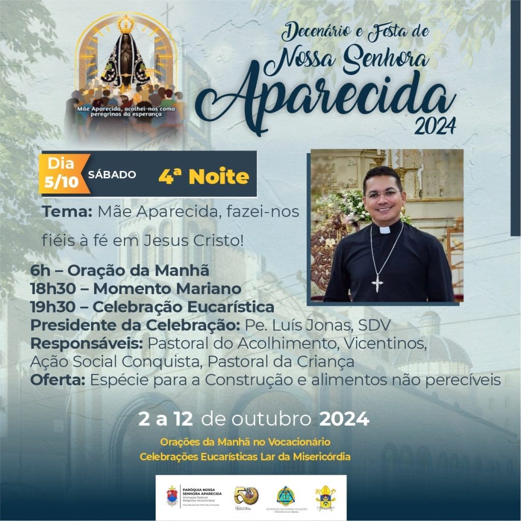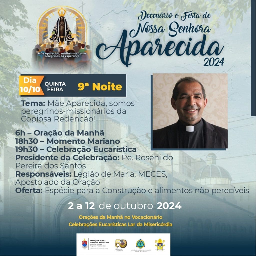 A partir do dia 2 de outubro, a Paróquia Nossa Senhora Aparecida, confiada aos cuidados dos Religiosos Vocacionistas, dará início ao seu Decenário em preparação para a Festa de sua excelsa padroeira, celebrada no dia 12 de outubro. Confira a programação destes próximos dias festivos na Paróquia e, logo abaixo, um pouco da história da Padroeira do Brasil.