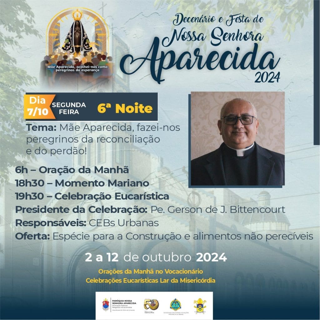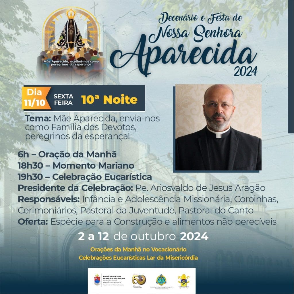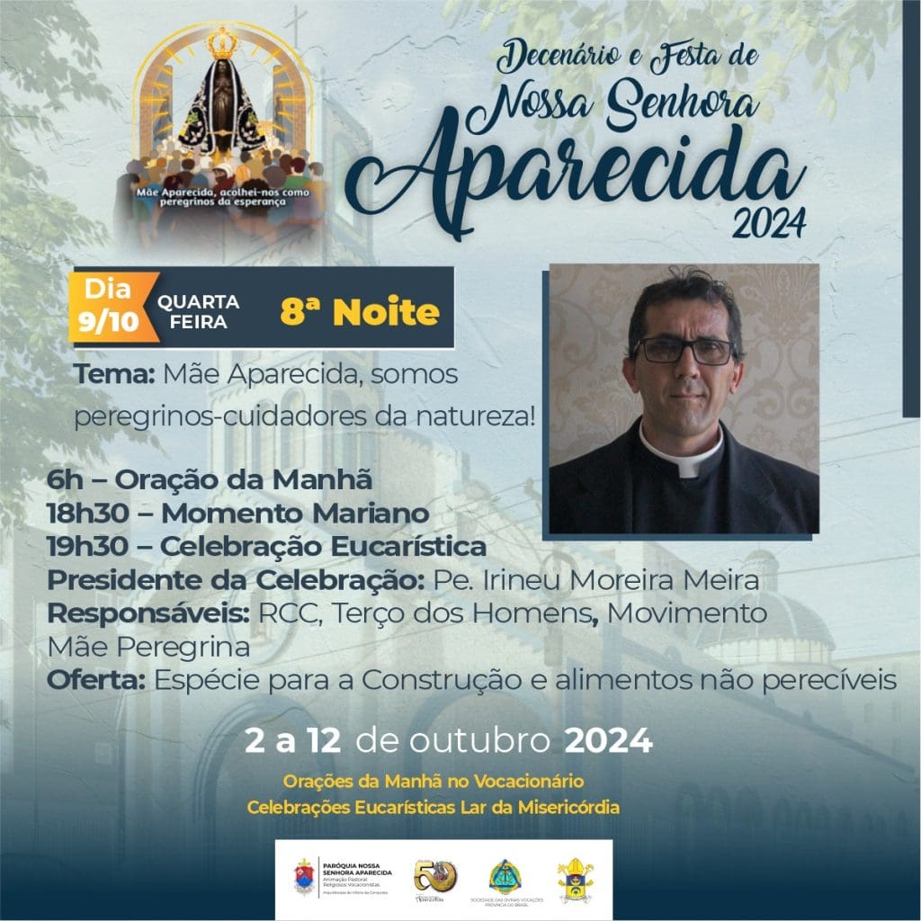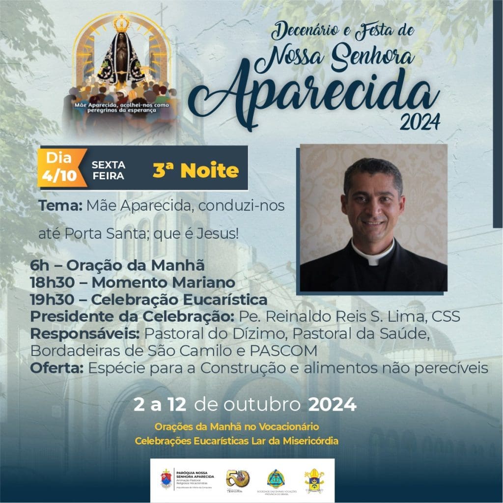 A partir do dia 2 de outubro, a Paróquia Nossa Senhora Aparecida, confiada aos cuidados dos Religiosos Vocacionistas, dará início ao seu Decenário em preparação para a Festa de sua excelsa padroeira, celebrada no dia 12 de outubro. Confira a programação destes próximos dias festivos na Paróquia e, logo abaixo, um pouco da história da Padroeira do Brasil.