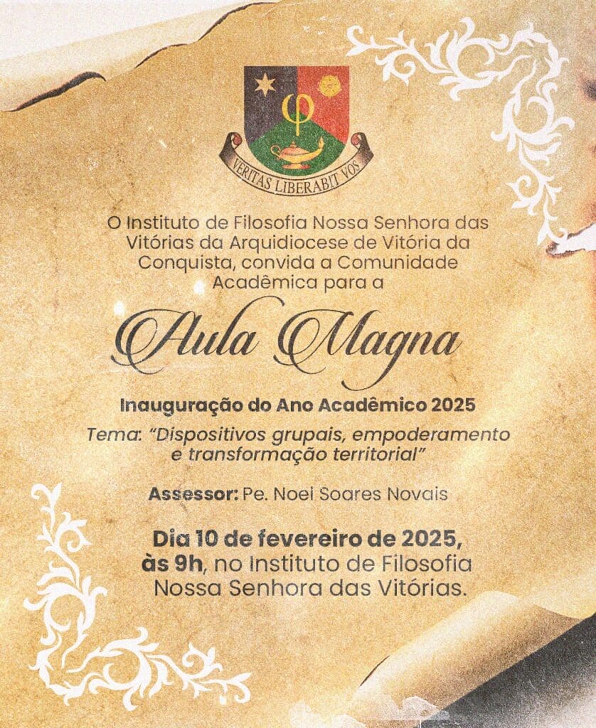 Tendo em vista o início do ano formativo e a inauguração do ano acadêmico para os seminaristas que aqui fazem sua formação filosófica, o Instituto de Filosofia Arquidiocesano está promovendo uma Aula Magna, ministrada pelo Pe. Noel Soares Novais, tratando do tema: “Dispositivos grupais, empoderamento e transformação territorial”. Este momento formativo acontecerá no dia 10 de fevereiro, às 09h.
