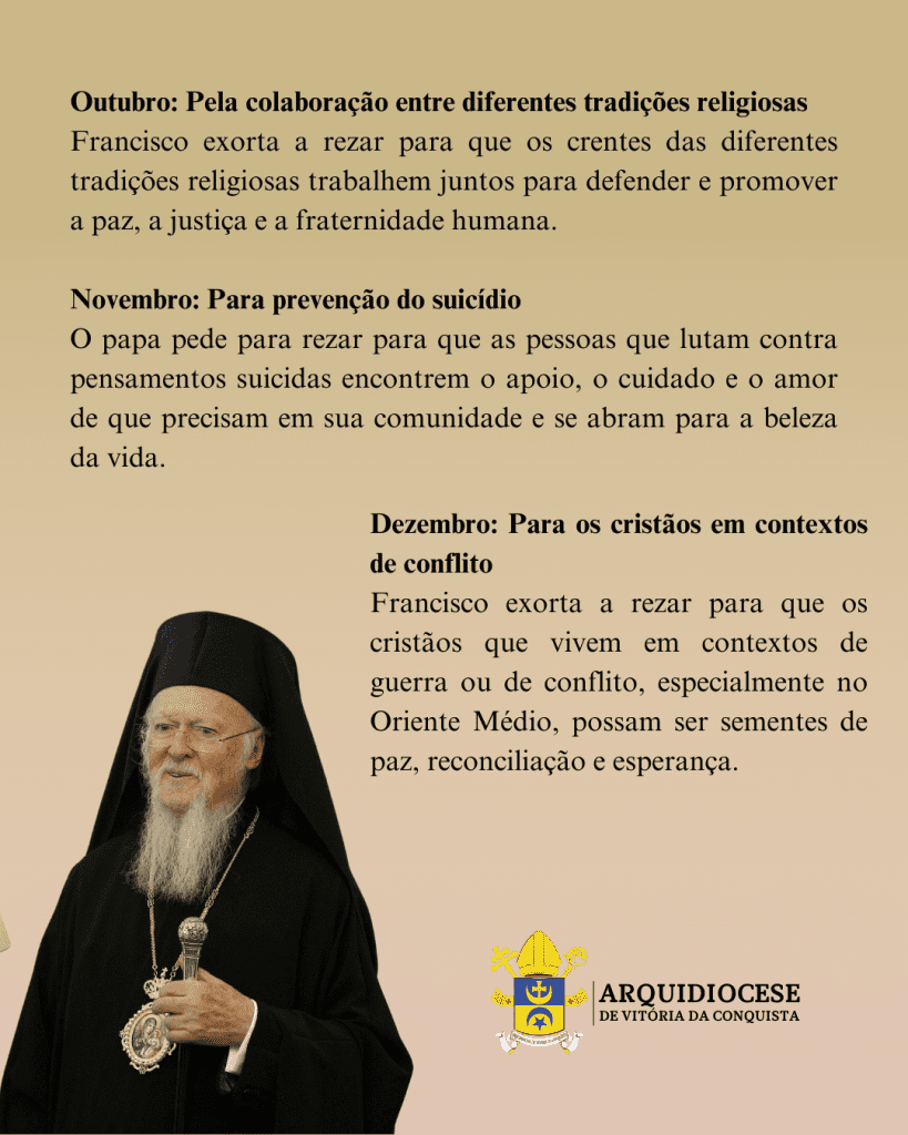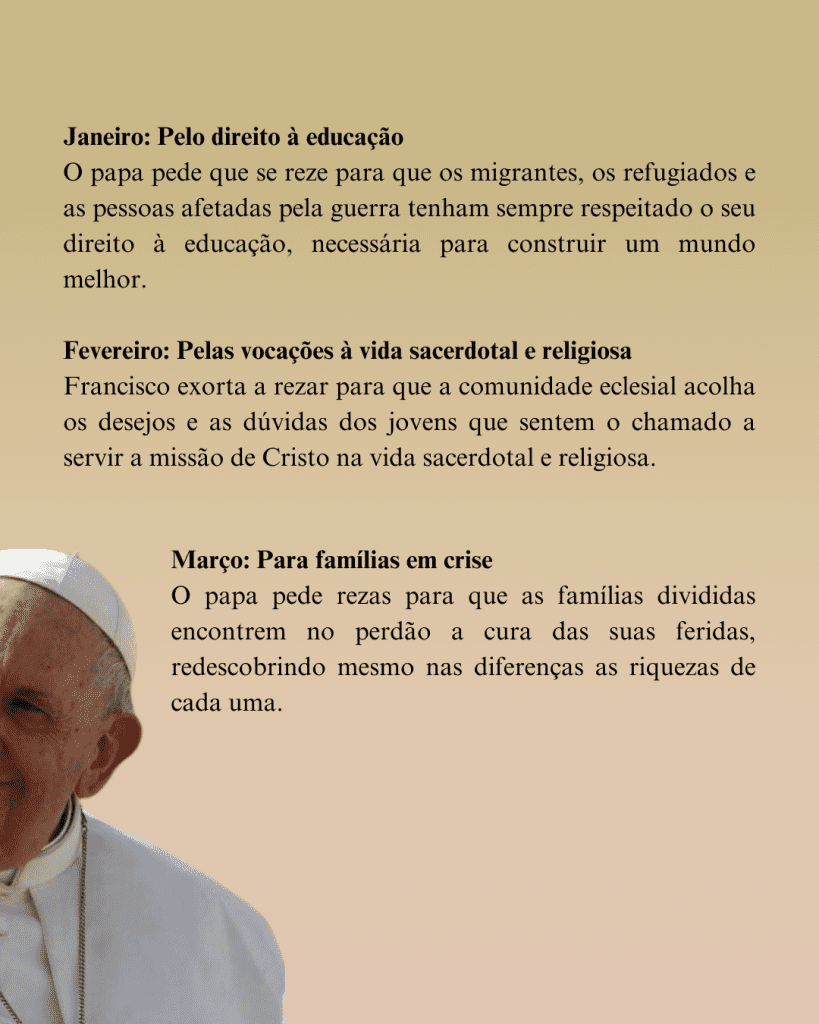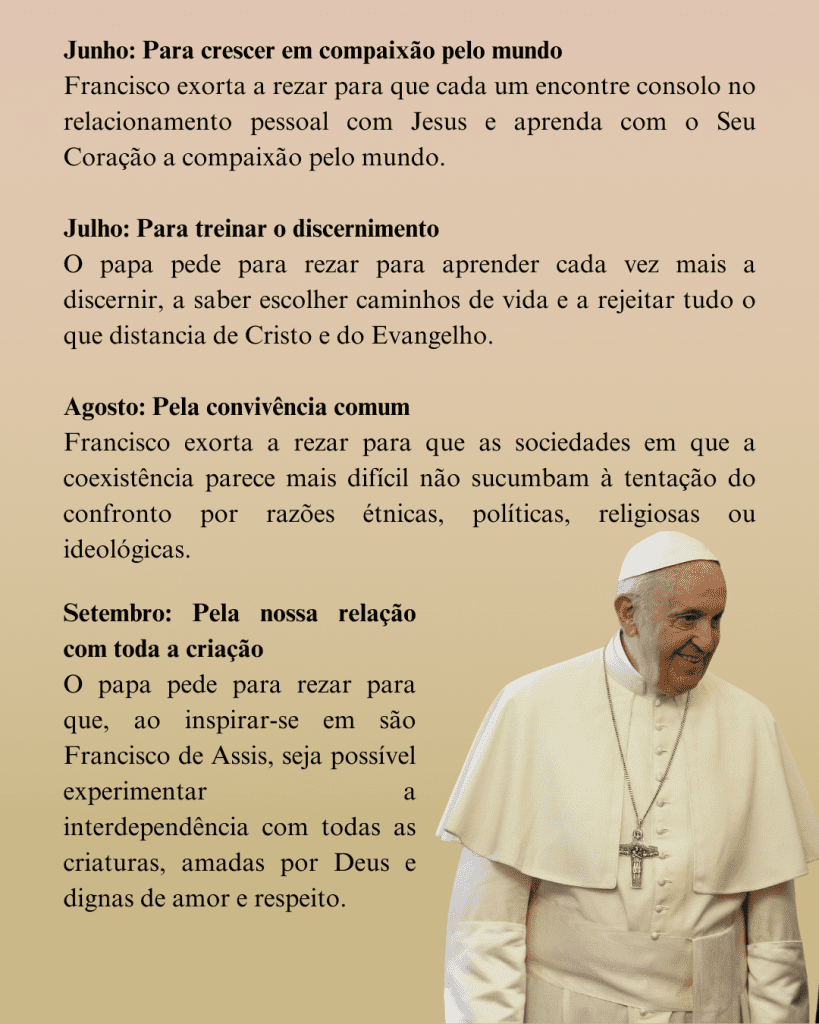 Todos os meses, o papa Francisco pede aos católicos de todo o mundo que rezem em uma determinada intenção. Essa iniciativa é acompanhada por um vídeo em que o papa diz as razões pelas quais escolheu aquela intenção específica.