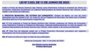 A proposta, de autoria do vereador Luís Carlos Dudé, foi apresentada em abril deste ano e aprovada por unanimidade na Câmara Municipal. Segundo o vereador, o reconhecimento reafirma a importância histórico-cultural do evento religioso. “A sanção desse projeto é de fundamental importância. Nossa Senhora das Vitórias é padroeira de Vitória da Conquista, e os festejos trazem muita alegria e esperança”.