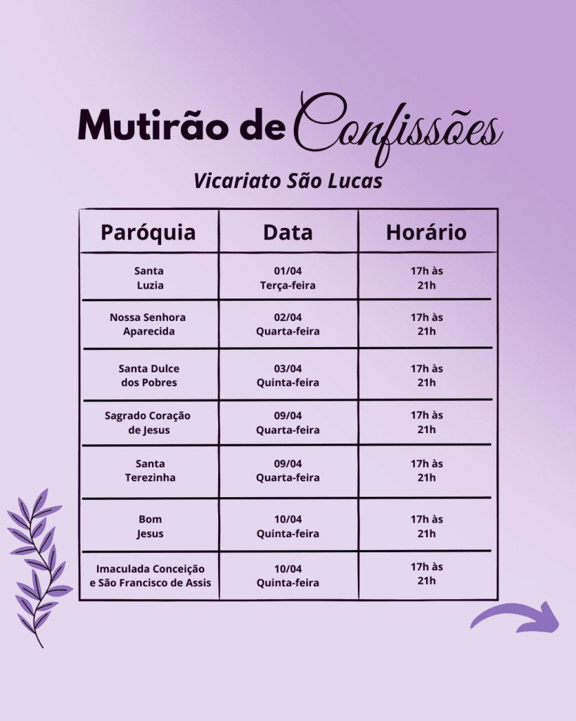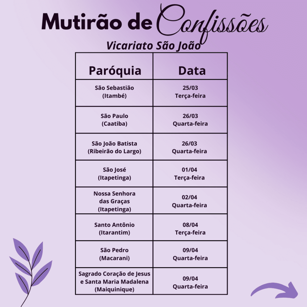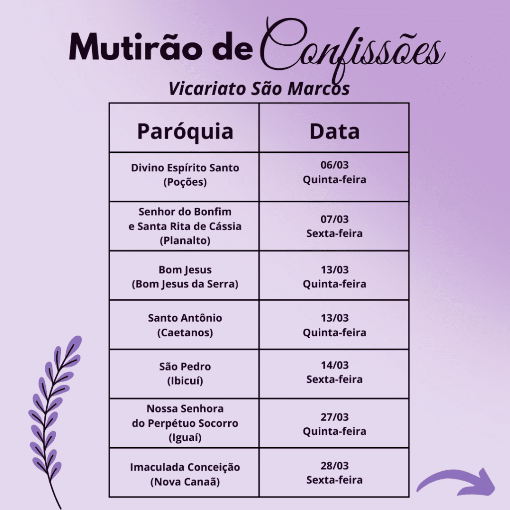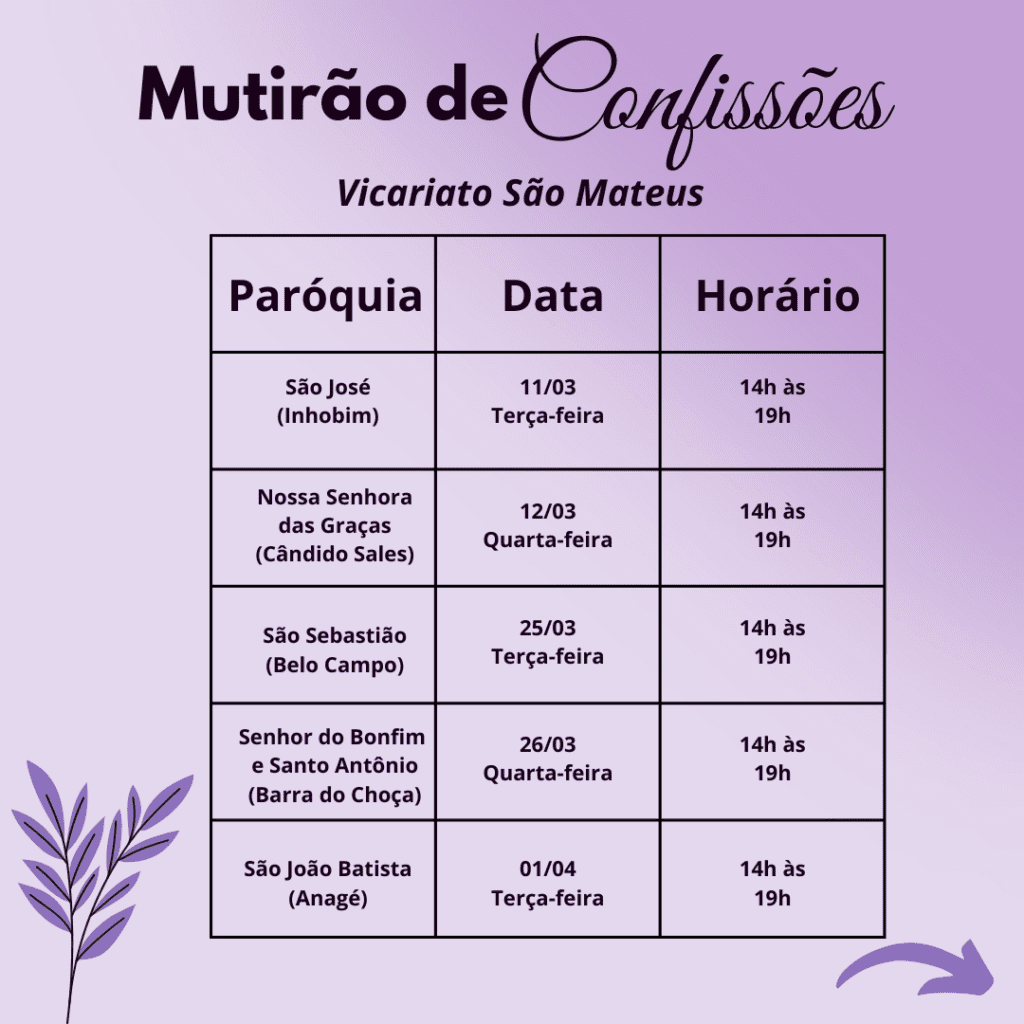Com o intuito de proporcionar aos fiéis uma profunda preparação espiritual para a celebração da Páscoa, a Arquidiocese de Vitória da Conquista, em seus Vicariatos São Lucas, São Mateus, São Marcos e São João, realizará um Mutirão de Confissões durante o período da Quaresma.