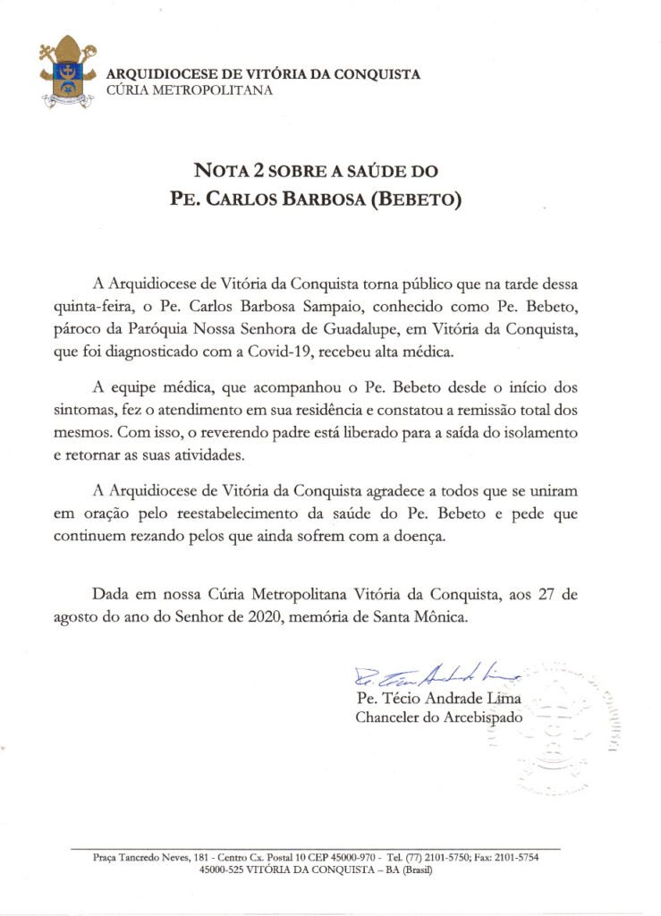 A Arquidiocese de Vitória da Conquista torna público que na tarde dessa quinta-feira, o Pe. Carlos Barbosa Sampaio, conhecido como Pe. Bebeto, pároco da Paróquia Nossa Senhora de Guadalupe, em Vitória da Conquista, que foi diagnosticado com a Covid-19, recebeu alta médica.