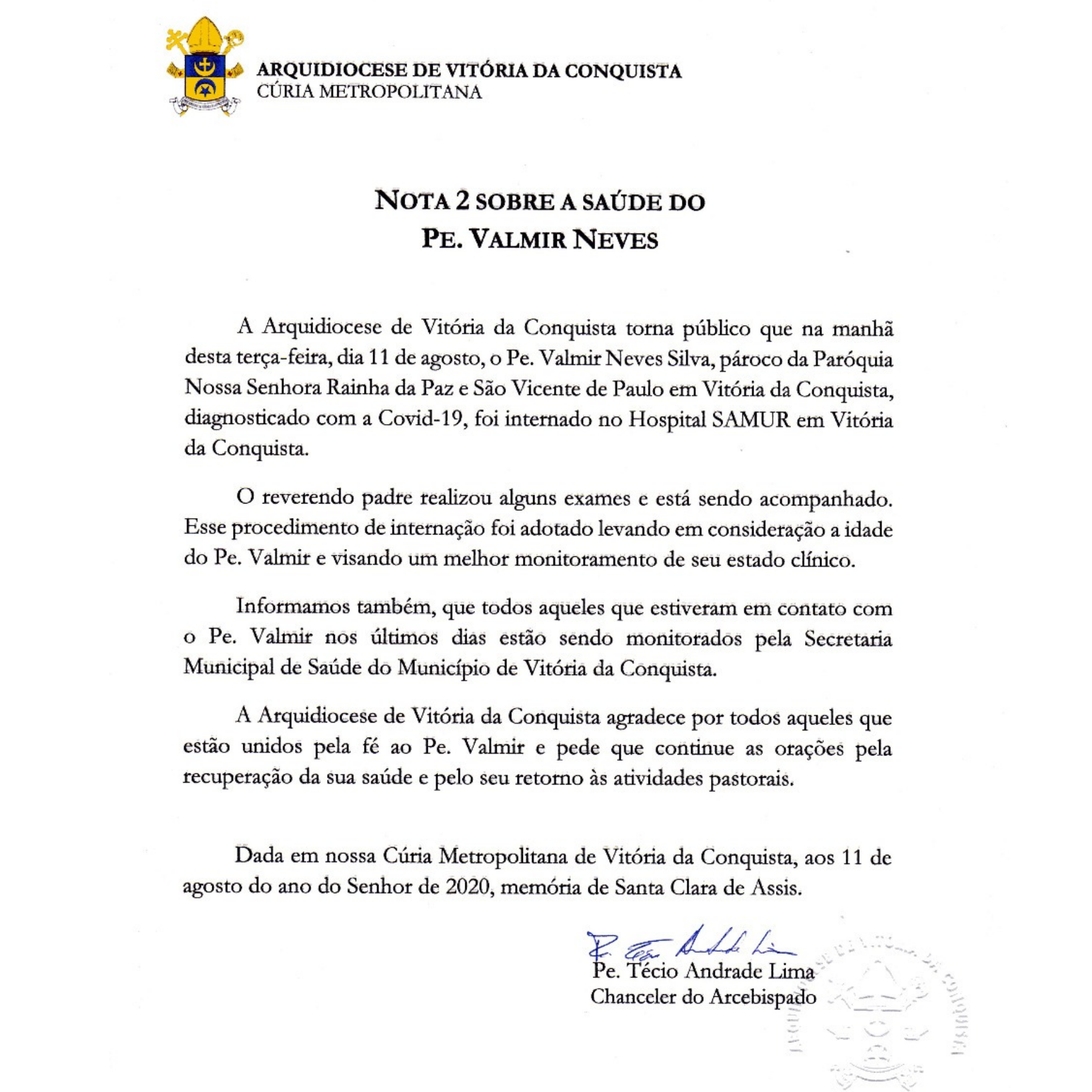 A Arquidiocese de Vitória da Conquista torna público que na manhã desta terça-feira, dia 11 de agosto, o Pe. Valmir Neves Silva, pároco da Paróquia Nossa Senhora Rainha da Paz e São Vicente de Paulo em Vitória da Conquista, diagnosticado com a Covid-19, foi internado no Hospital SAMUR em Vitória da Conquista.