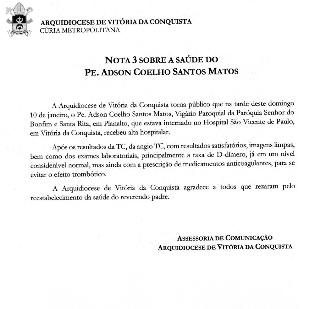 10 de janeiro, o Pe. Adson Coelho Santos Matos, Vigário Paroquial da Paróquia Senhor do Bonfim e Santa Rita, em Planalto, que estava internado no Hospital São Vicente de Paulo, em Vitória da Conquista, recebeu alta hospitalar.