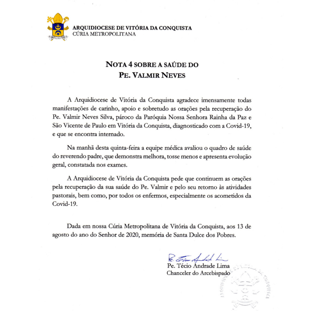 A Arquidiocese de Vitória da Conquista pede que continuem as orações pela recuperação da sua saúde do Pe. Valmir e pelo seu retorno às atividades pastorais, bem como, por todos os enfermos, especialmente os acometidos da Covid-19.