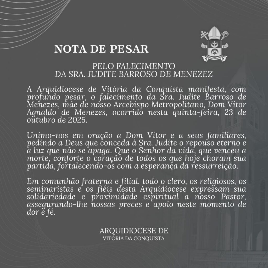 A Arquidiocese de Vitória da Conquista manifesta, com profundo pesar, comunica o falecimento da Sra. Judite Barroso de Menezes, mãe de nosso Arcebispo Metropolitano, Dom Vítor Agnaldo de Menezes, ocorrido nesta quinta-feira, 23 de outubro de 2025.