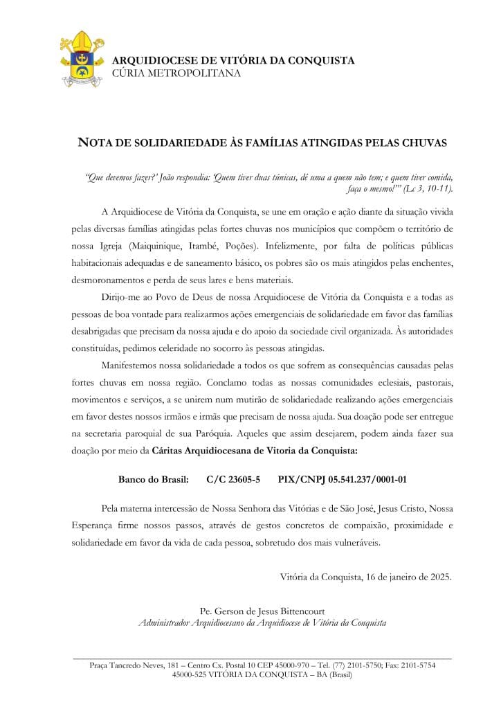 Dirijo-me ao Povo de Deus de nossa Arquidiocese de Vitória da Conquista e a todas as pessoas de boa vontade para realizarmos ações emergenciais de solidariedade em favor das famílias desabrigadas que precisam da nossa ajuda e do apoio da sociedade civil organizada. Às autoridades constituídas, pedimos celeridade no socorro às pessoas atingidas.