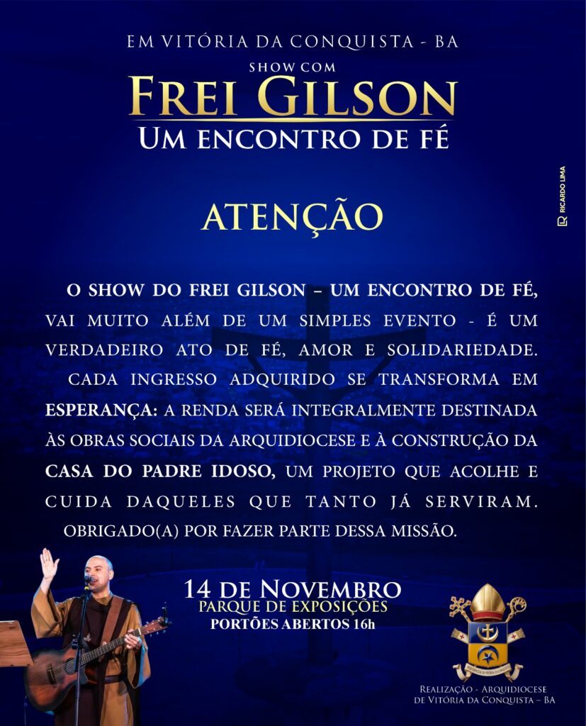 No dia 14 de novembro do corrente ano, a Arquidiocese e Vitória da Conquista realizará o Evento “Um encontro de Fé” com a presença do Frei Gilson no Parque de Exposições Teopompo de Almeida. O lançamento oficial aconteceu no dia 09 de abril, juntamente com as vendas do 1º lote de ingressos.