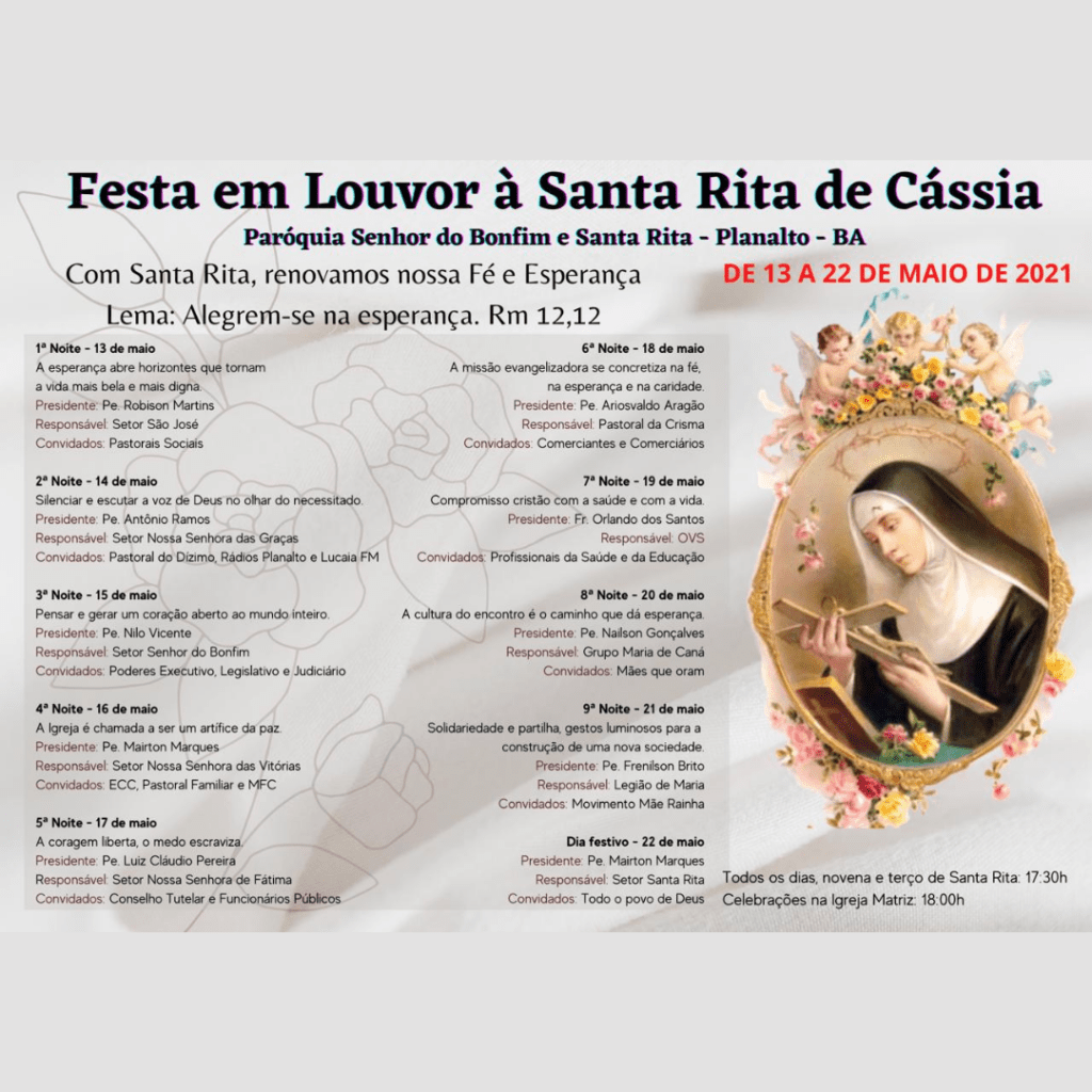 Neste ano, a festa teve como tema “Com Santa Rita, renovamos nossa Fé e Esperança”e o lema “Alegrem-se na esperança” (Rm 12,12).