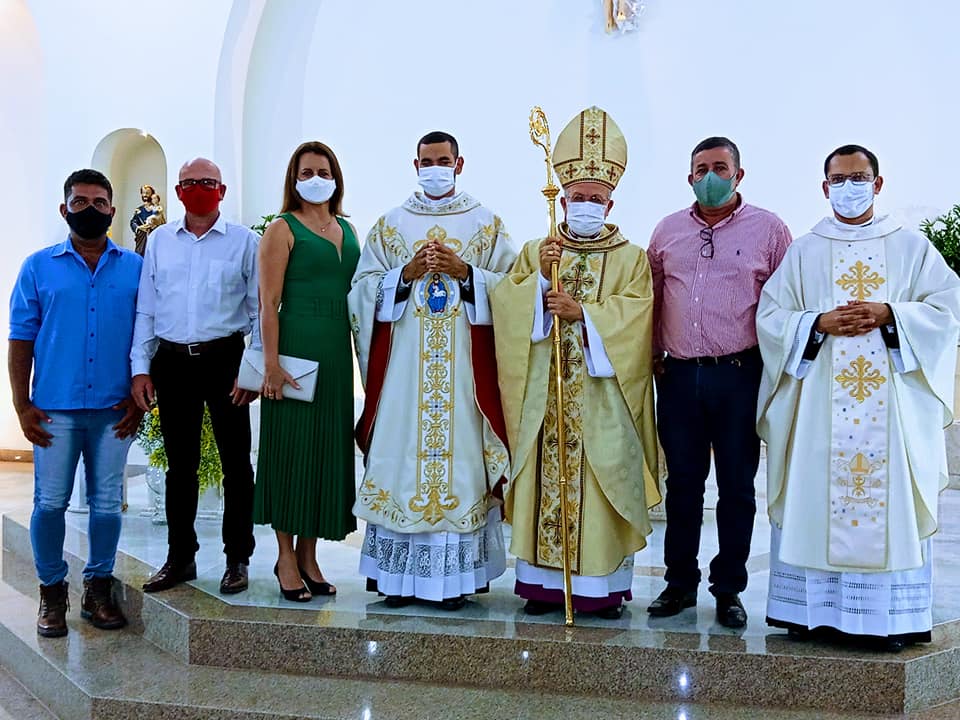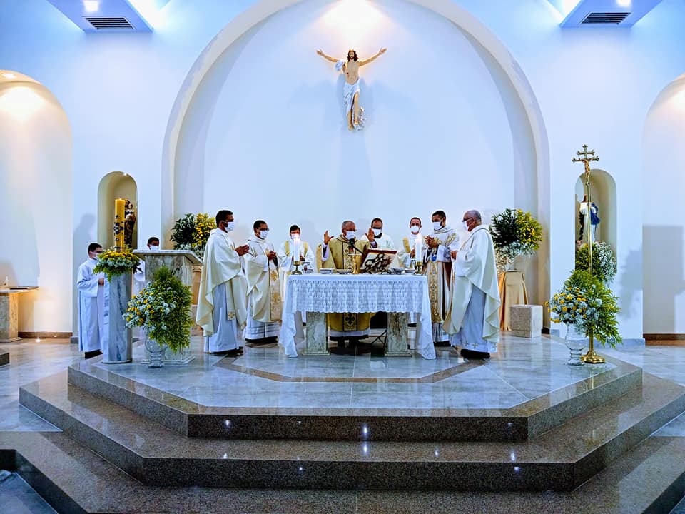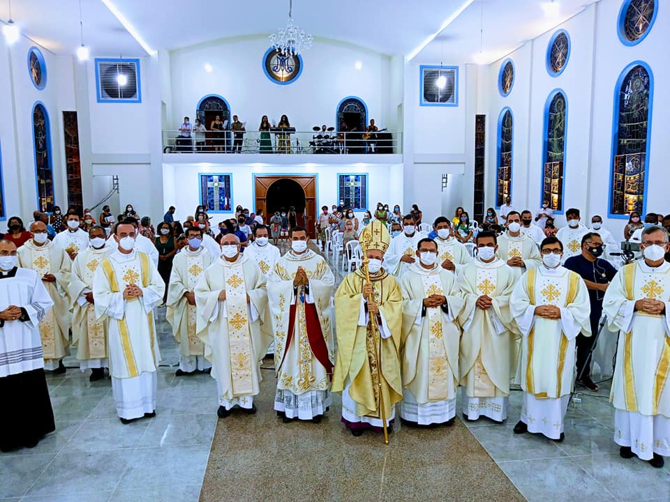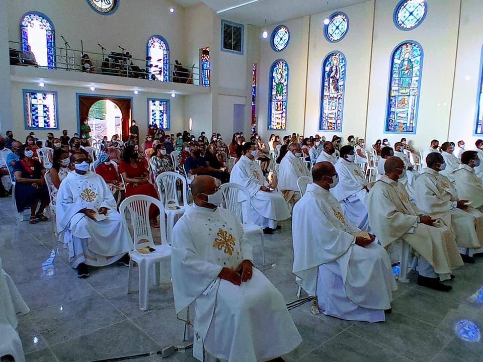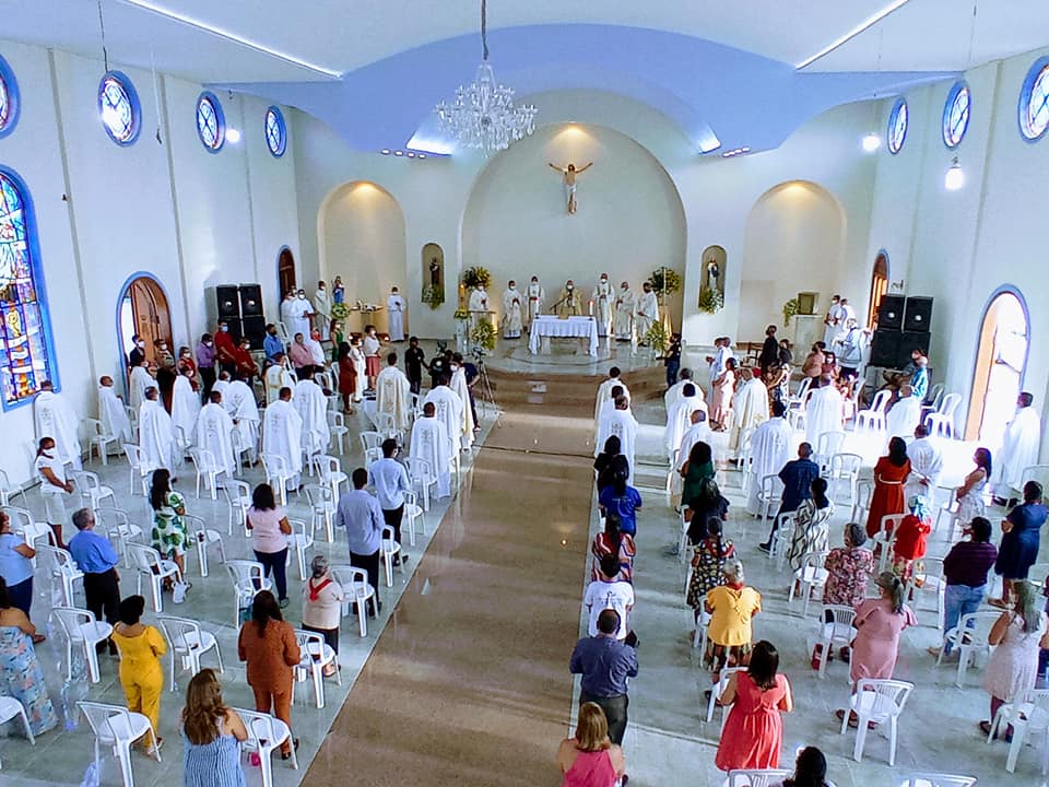 Antes de iniciar a Santa Eucaristia, Dom Josafá Menezes, Arcebispo Metropolitano, adentrou a igreja aspergindo os presentes, sendo ladeado pelo Pe. Nailson Gonçalves, Administrador Paroquial e pelo Diác. Dhonis, e dirigiram-se, para o Santíssimo Sacramento, onde permaneceram alguns instantes em oração.