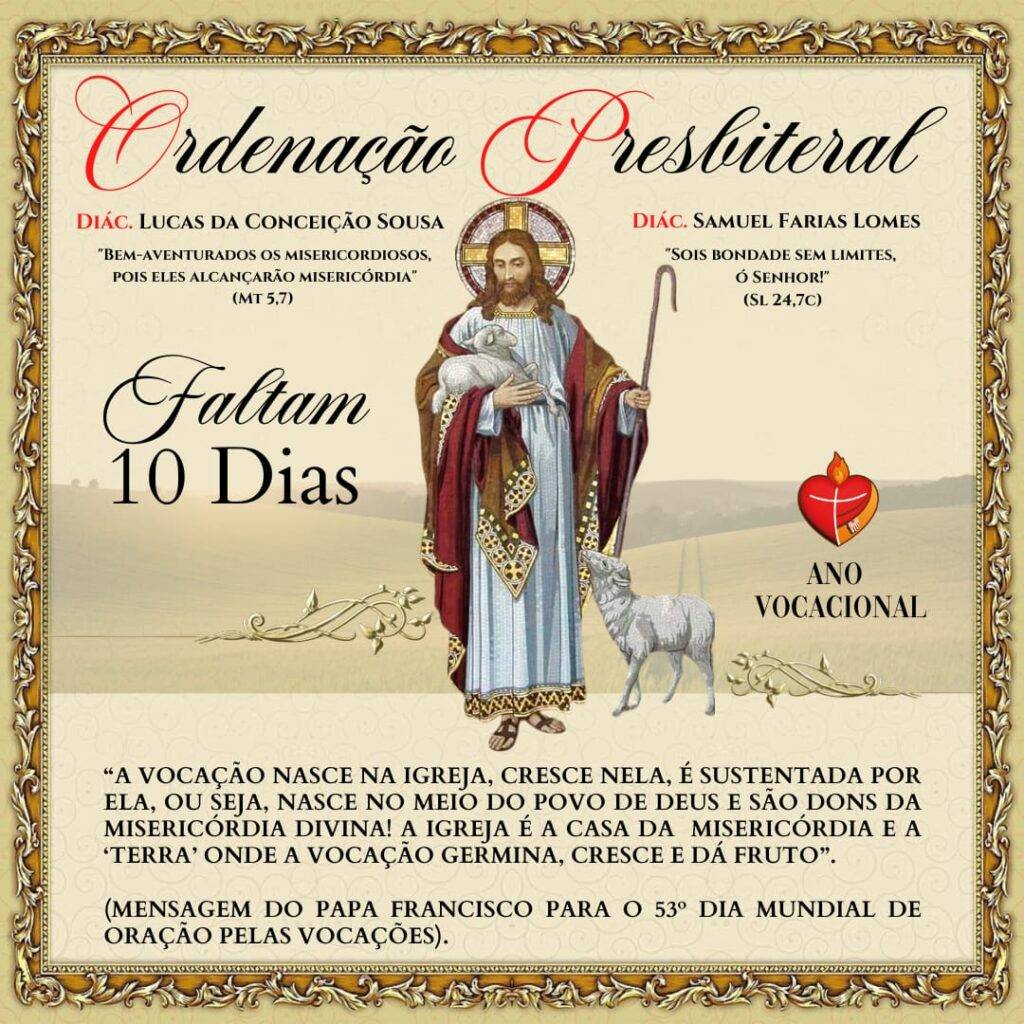 A Arquidiocese de Vitória da Conquista, convida em nome dos referidos Diáconos, para a Ordenação Presbiteral dos mesmos, que acontecerá no dia 29 de abril, sábado, na Paróquia Nossa Senhora Rainha da Paz e São Vicente de Paulo, às 16h.