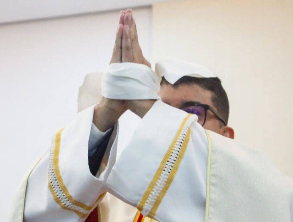Logo em seguida, suas mãos foram amarradas, e sendo desamarradas pelos seus pais, que foram os primeiros a receberem sua bênção sacerdotal.