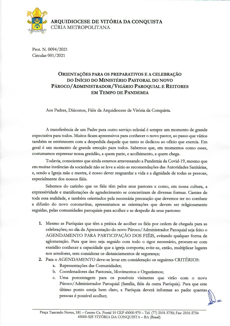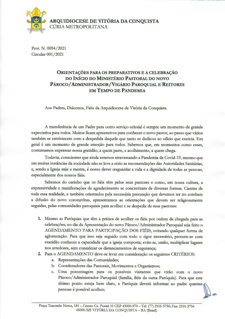 Dada em nossa Cúria Metropolitana de Vitória da Conquista, aos 25 dias do mês de janeiro do ano do Senhor de 2021, Festa da Conversão de São Paulo, Apóstolo.