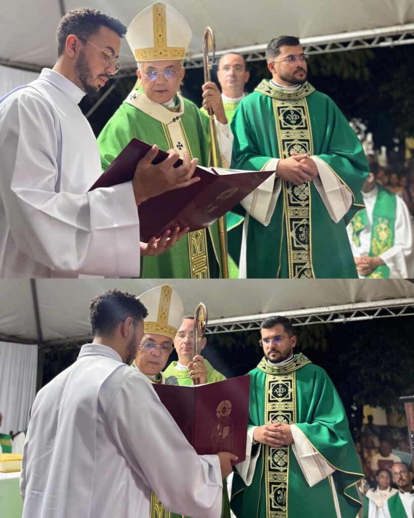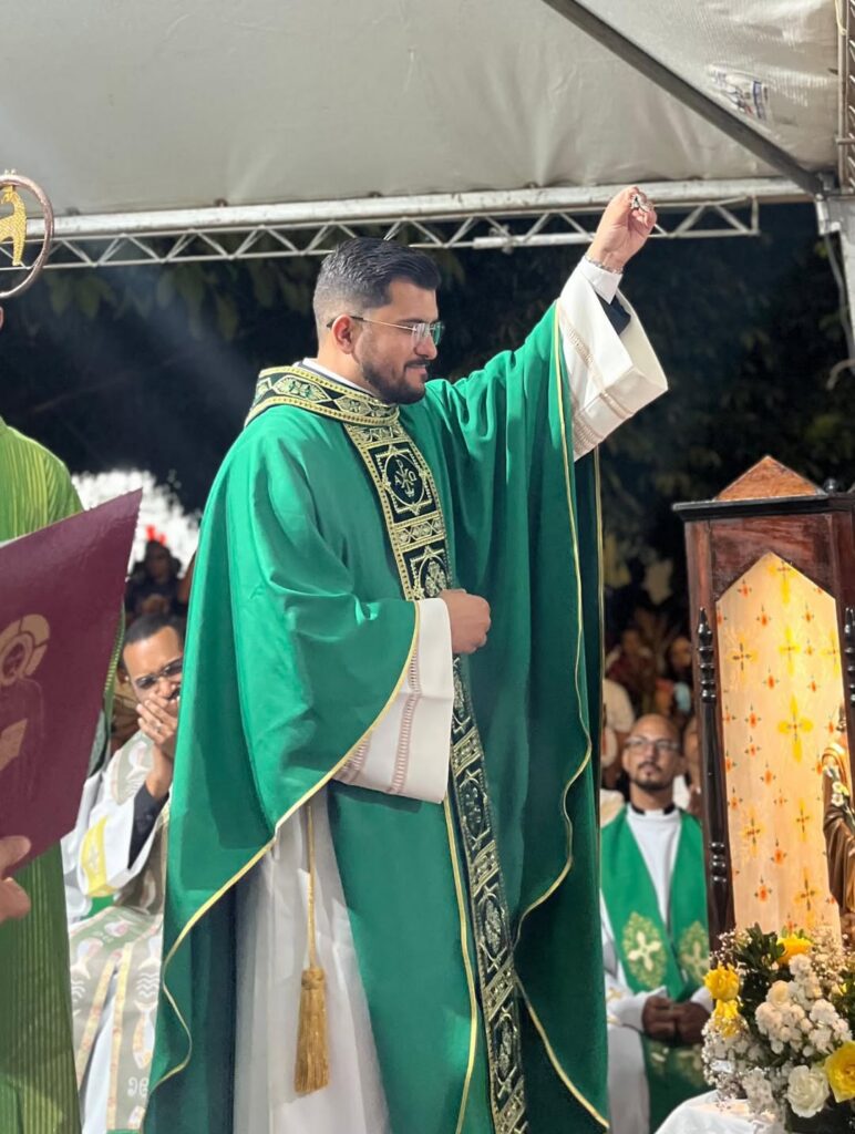 Durante o rito de posse, o Pe. José Victor recebeu os símbolos que acompanharão seu ministério pastoral: a chave da igreja, a chave do sacrário, os Santos Óleos e a estola roxa, sinal do compromisso com o sacramento da Reconciliação.