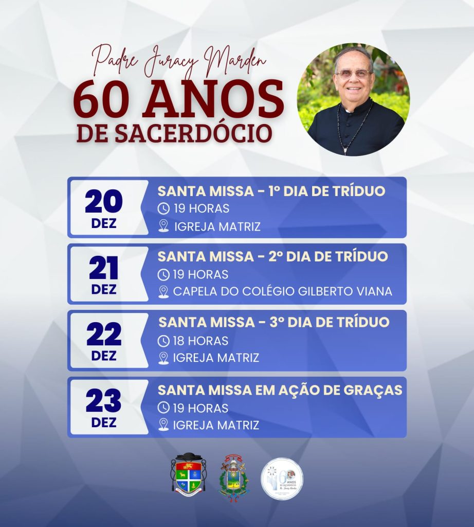 A celebração dos 60 anos de ordenação presbiteral do Padre Juracy será um momento de gratidão e reconhecimento por sua dedicação à Igreja e à comunidade. A programação contará com um Tríduo e o dia de celebração festiva por essa data tão especial.