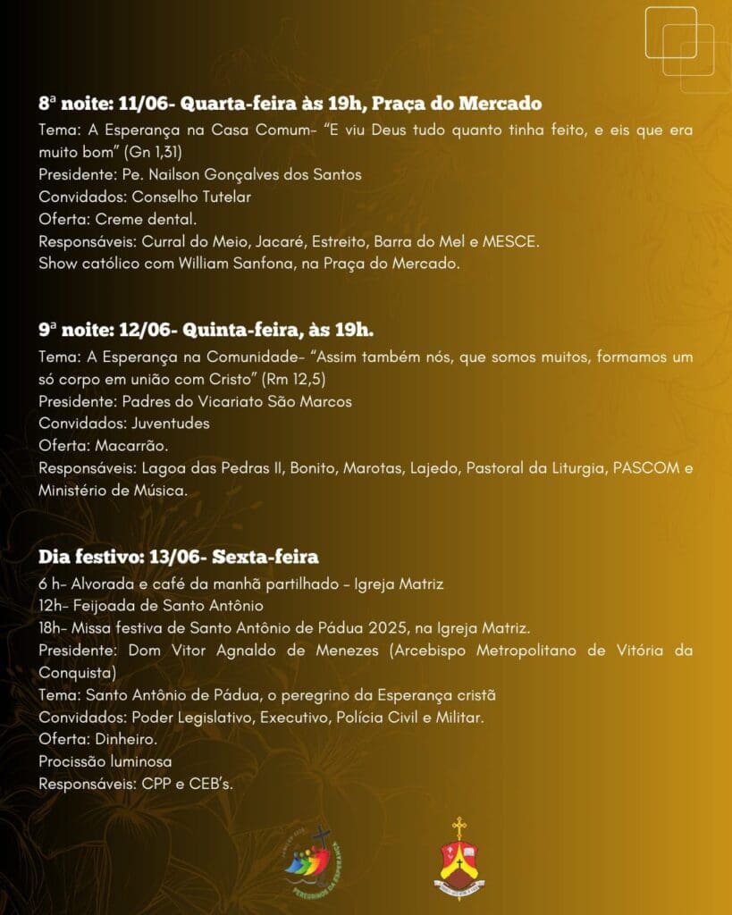 Na Arquidiocese de Vitória da Conquista, duas Paróquias têm o grandioso Santo Antônio como seu Padroeiro (uma em Itarantim – BA e outra em Caetanos – BA). Além delas, outras Paróquias o têm como co-padroeiro. Aproximando-se o dia 13 de junho, dia da comemoração deste santo, as Paróquias Santo Antônio iniciarão seus novenários, preparando-se para o grande dia da festa, nesta terça-feira, dia 4 de junho.