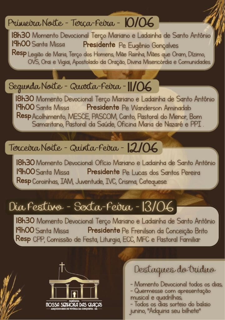 Confira programação do Tríduo de Santo Antônio – Paróquia Nossa Senhora das Graças
